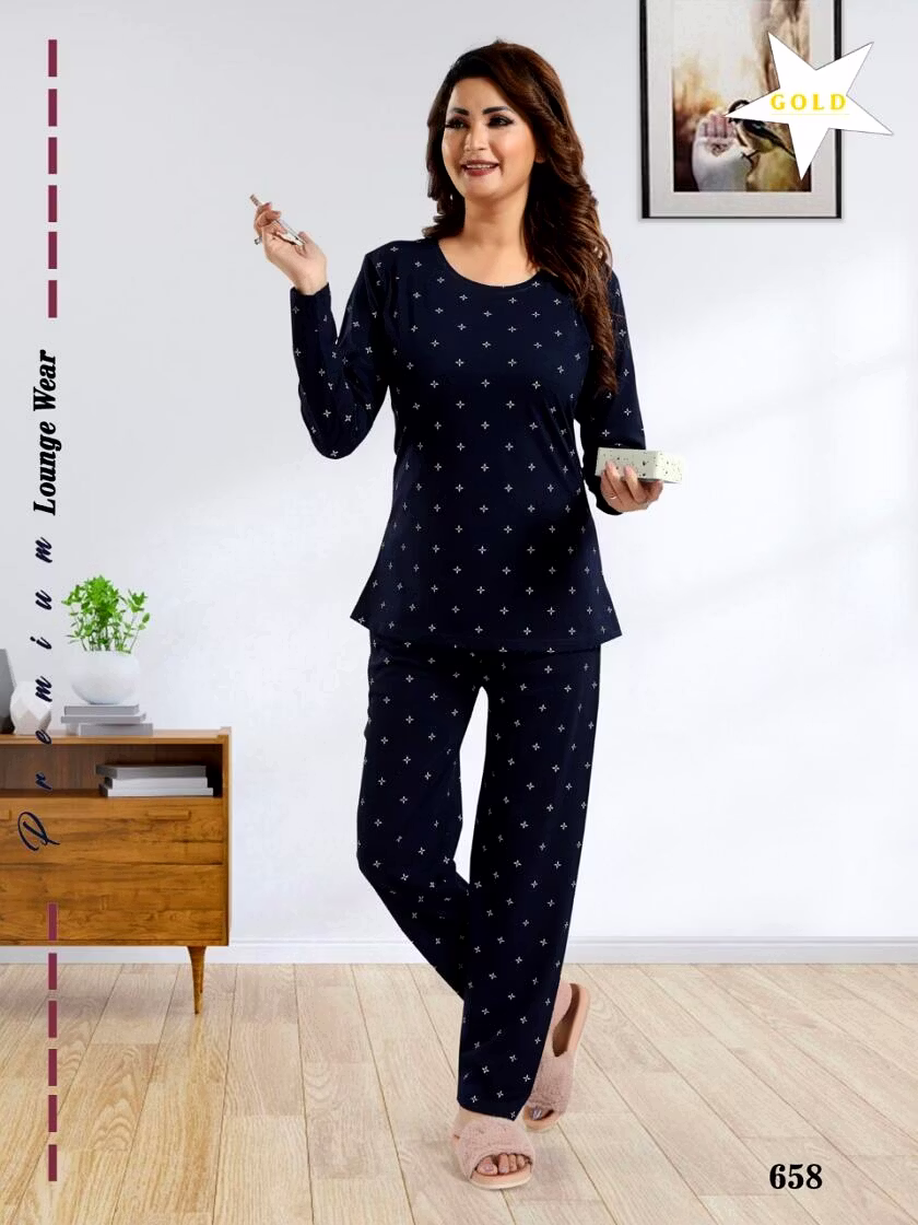 Our Premium Ladies Hosiery T-shirt Pajama Full Sleeves Night Suit Design No. 658 PL160 is designed to provide maximum comfort and breathability. Made from high-quality cotton hosiery, these panties offer a soft texture and moisture-wicking properties, keeping you fresh all day long.
