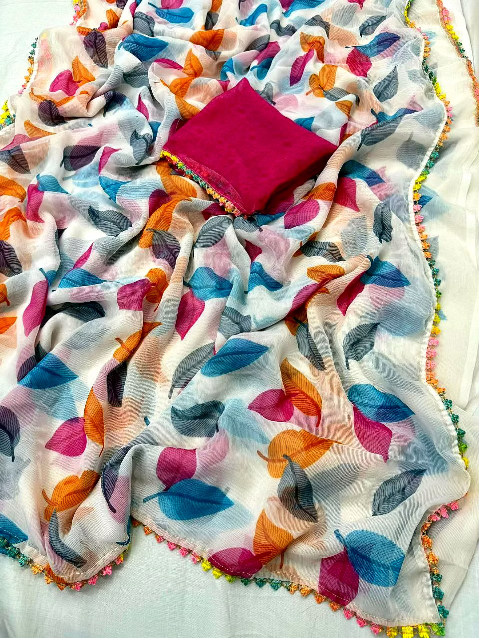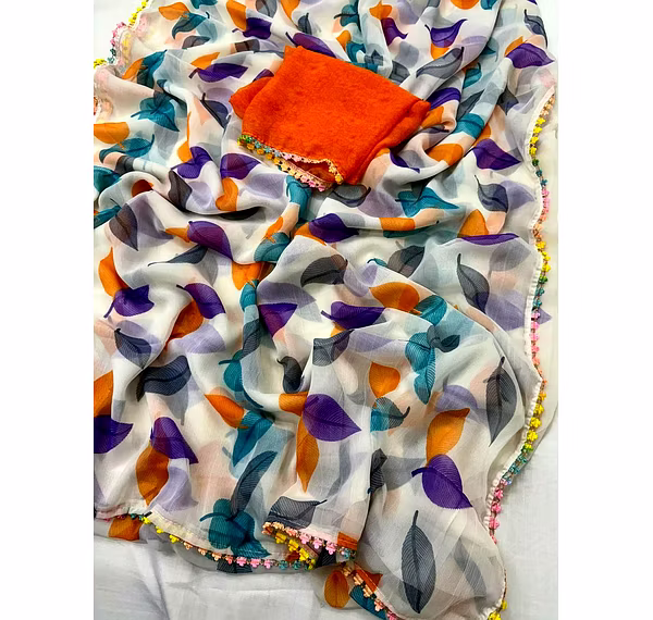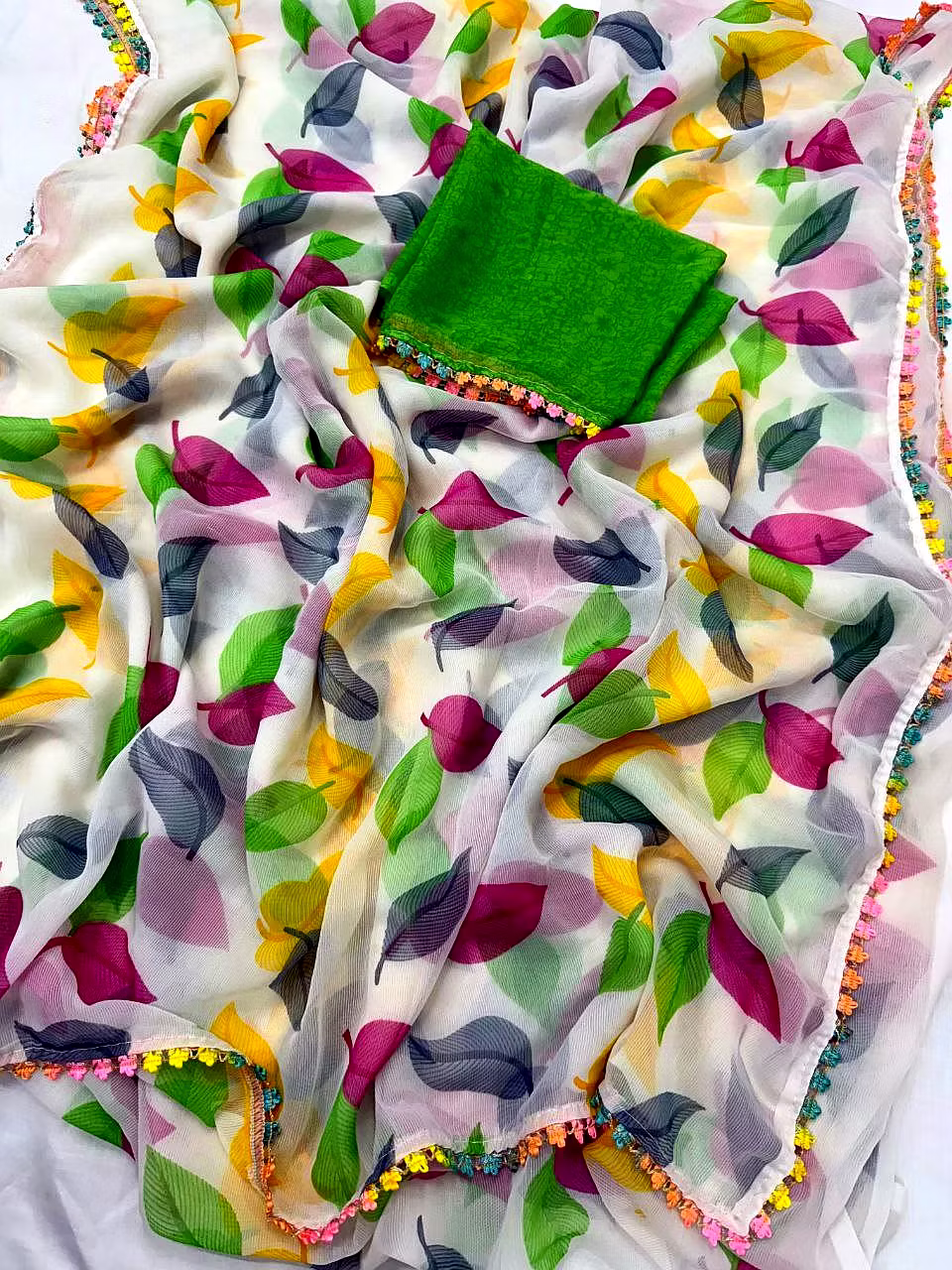 Experience the allure of digital prints on premium georgette fabric, offering a blend of style and sophistication. Whether it's a family gathering or a college function, this saree complements every occasion.
