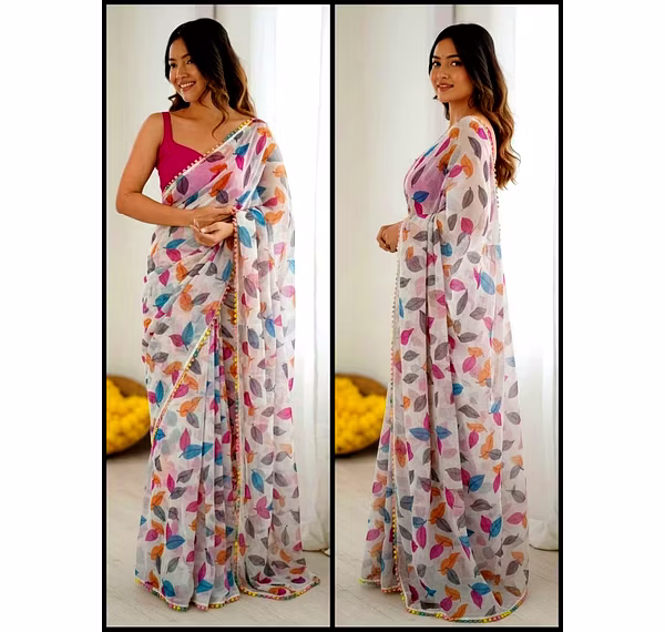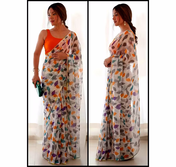 Indulge in the effortless grace of this georgette saree that seamlessly transitions from office wear to festive celebrations. Embrace versatile styling options for everyday elegance.