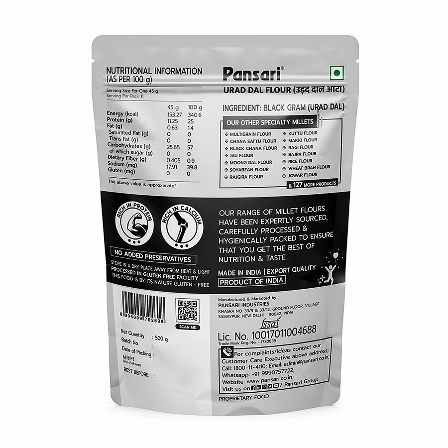 Made from premium quality urad dal (black gram), this flour is finely milled to deliver a smooth and consistent texture, ideal for preparing dosa, idli, vada, papad, and other traditional Indian recipes.