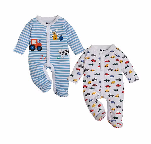 Get your little one ready for fun-filled dreams with the Bontots Organic Cotton Baby Sleepsuit Combo, featuring two delightful prints—"Farmyard Fun" with tractors, cows, and windmills (Blue Stripes) and "Car print" with colorful cars and bikes (White).