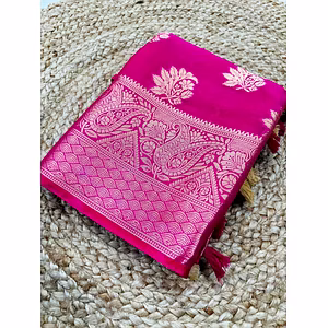 This Pure Chinnon saree with pure jacquard Zari butta is a stunning piece that will instantly elevate your wardrobe. Its all-over body design is intricately woven with pure Zari butta, adding a touch of sophistication to the saree. The saree's jacquard border and rich pallu are thoughtfully designed to seamlessly complement the body, creating a beautiful and cohesive look. Crafted with the utmost care, this saree's quality materials ensure both comfort and durability, allowing you to enjoy this piece for years to come. The saree's brocade blouse adds a touch of elegance and sophistication, effortlessly tying the look together. The saree's unique selling points include its combination of traditional and modern design elements, making it an excellent choice for a variety of occasions. The Pure Chinnon fabric gives the saree a lightweight and airy feel, making it perfect for warmer weather. Overall, this saree is a must-have for any fashion-conscious individual looking for a timeless, elegant piece that will stand the test of time. Its impeccable craftsmanship, quality materials, and intricate design make it truly one-of-a-kind. Whether you're attending a wedding, celebrating a festival, or simply looking to add some glamour to your wardrobe, this saree is the perfect choice.