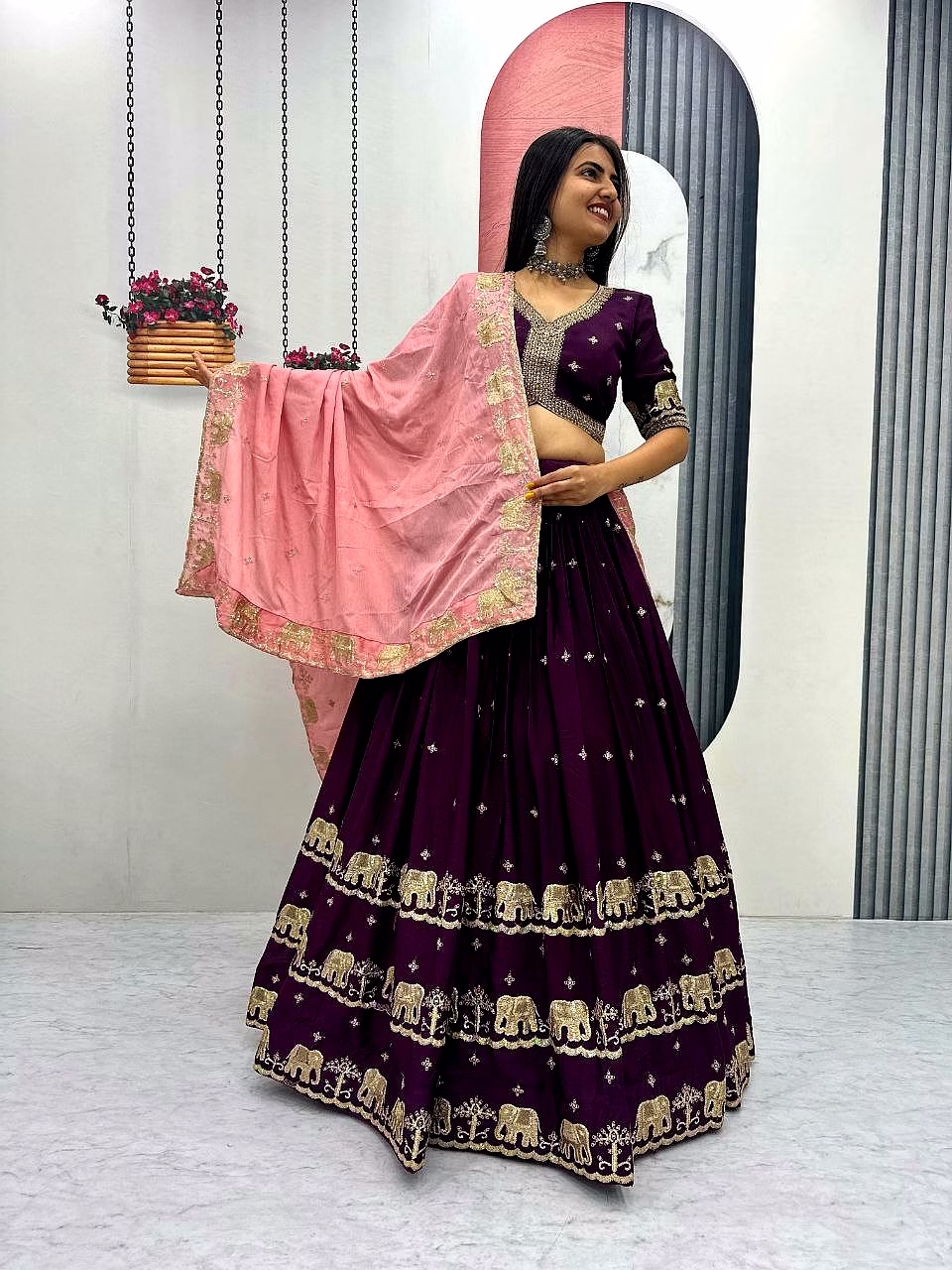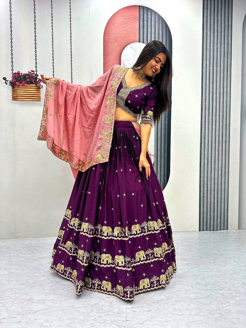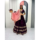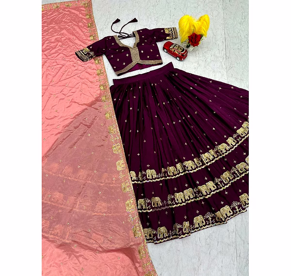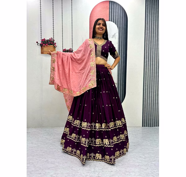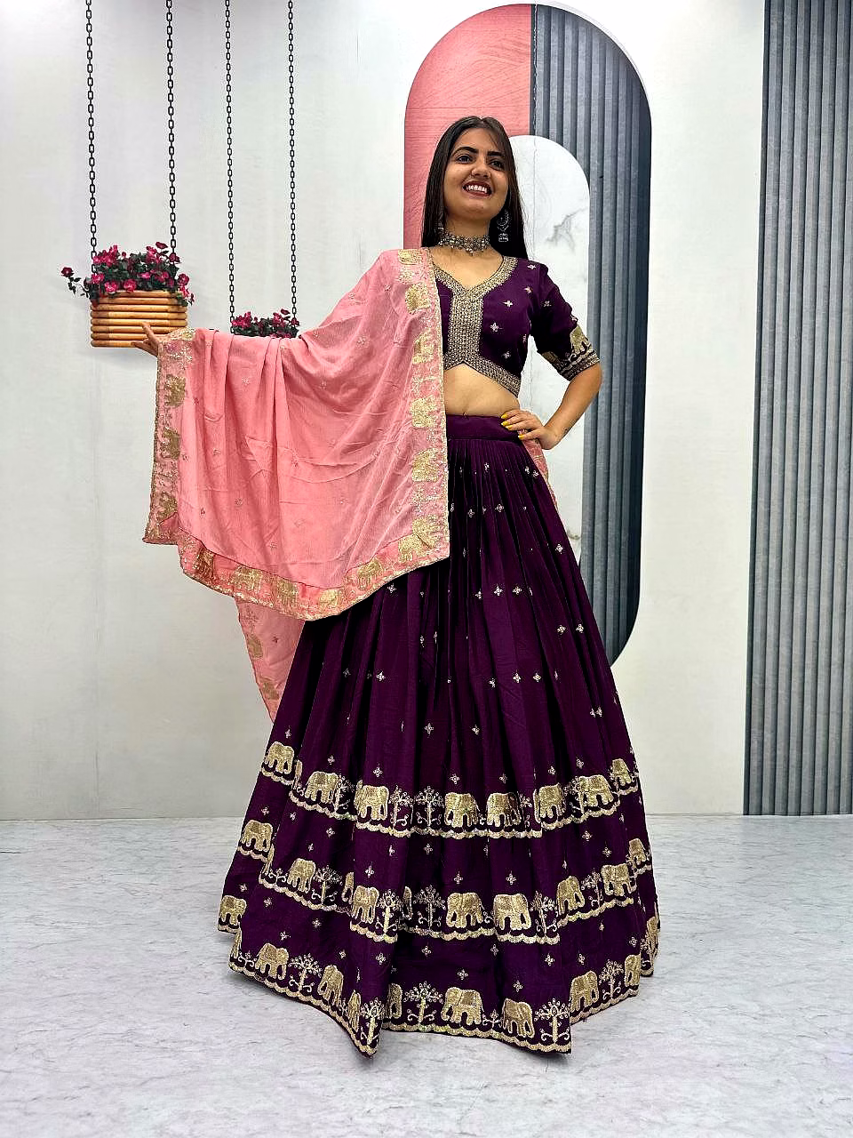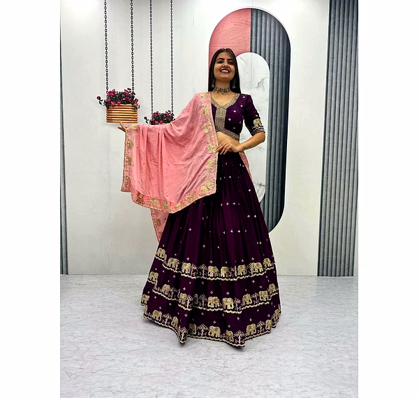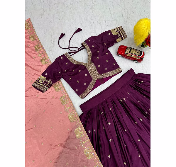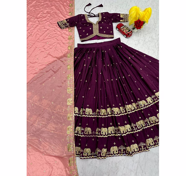 Elevate your ethnic wardrobe with this exquisite Pure Chinon Lehenga Choli set. Featuring intricate embroidery and shimmering sequence work, this fully stitched ensemble offers a seamless blend of luxury and comfort for your next big celebration.