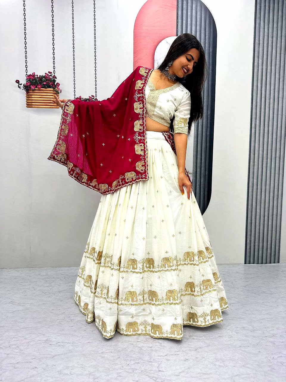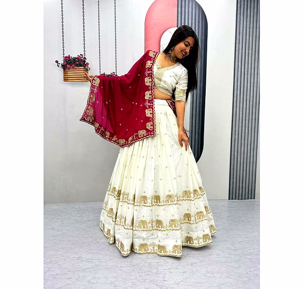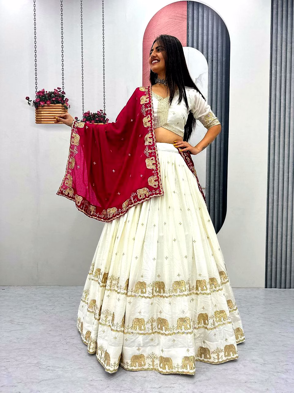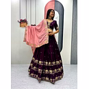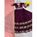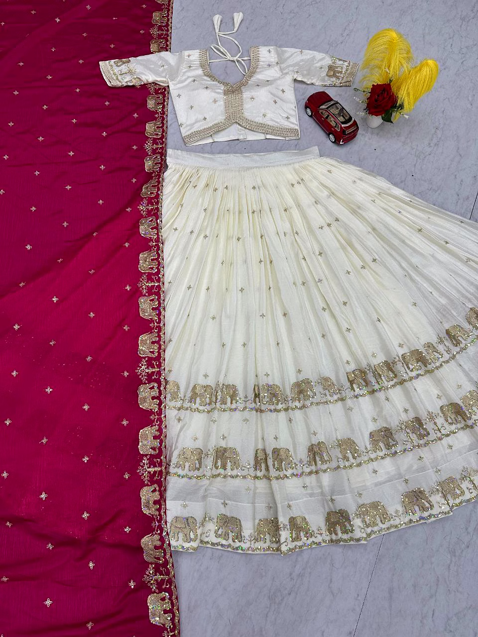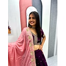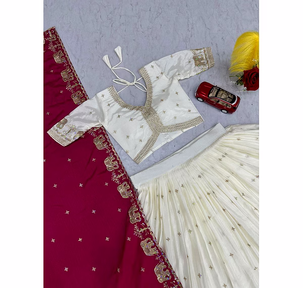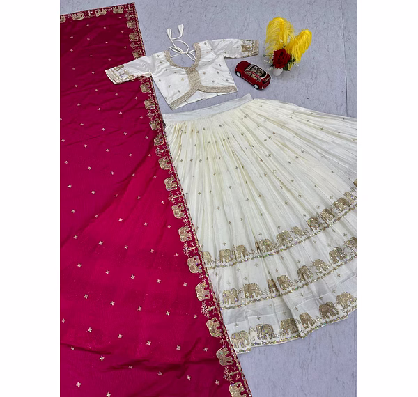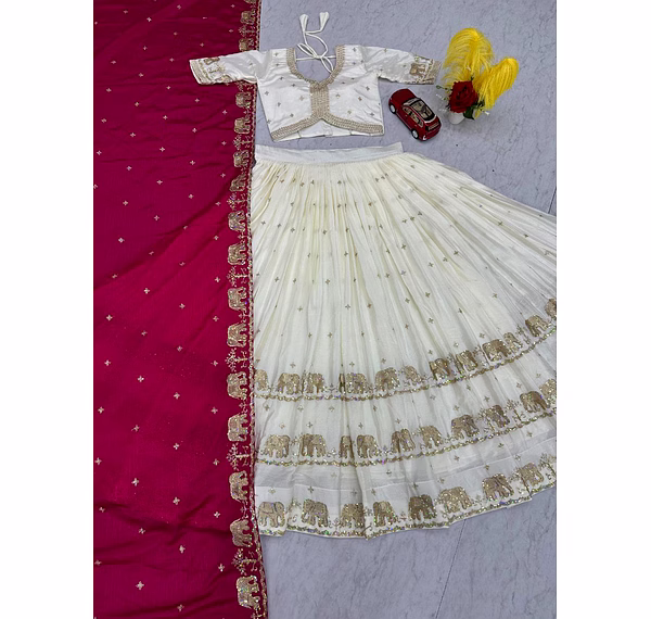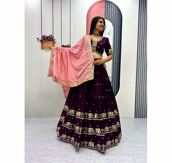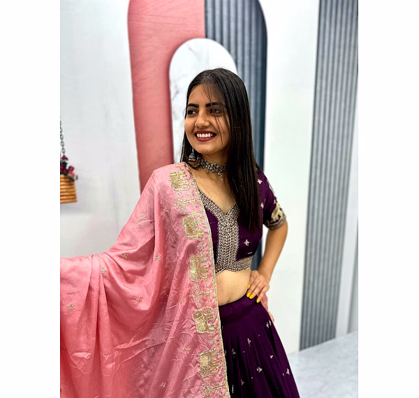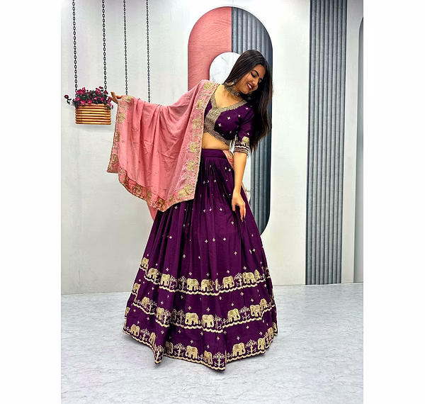Elevate your ethnic wardrobe with this exquisite Pure Chinon Lehenga Choli set. Featuring intricate embroidery and shimmering sequence work, this fully stitched ensemble offers a seamless blend of luxury and comfort for your next big celebration.