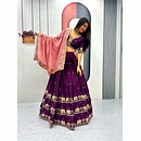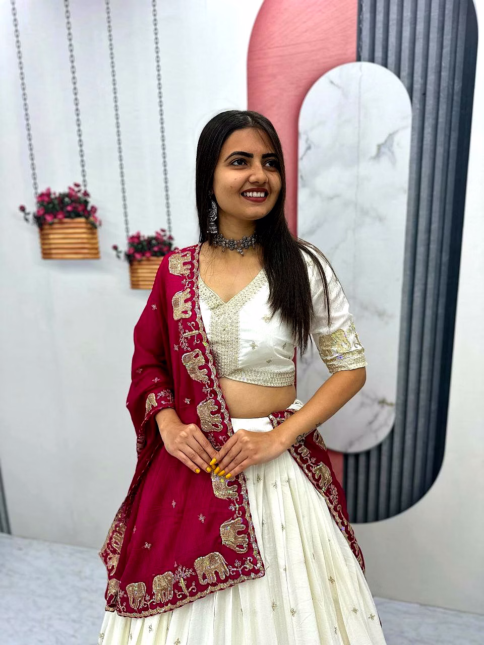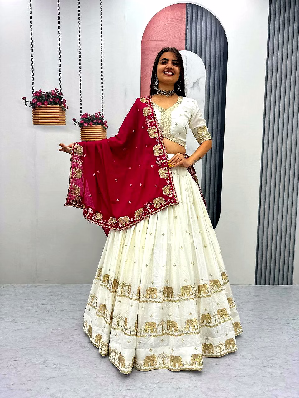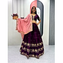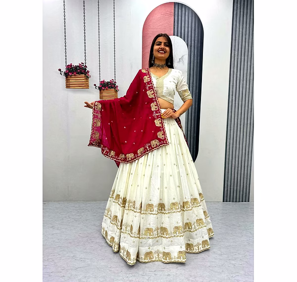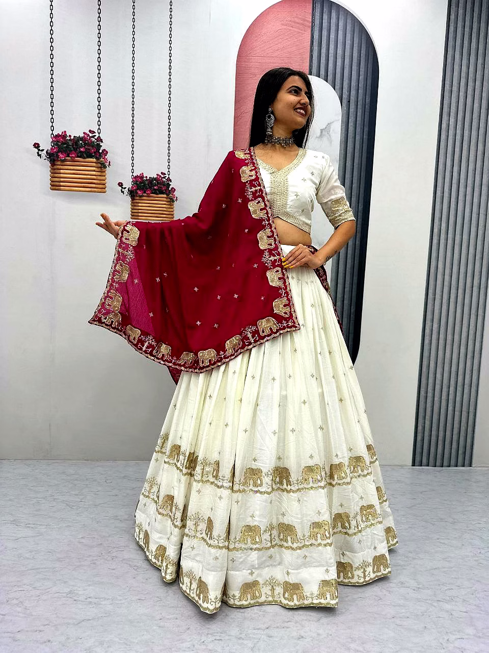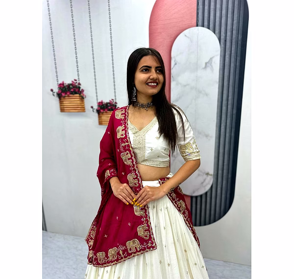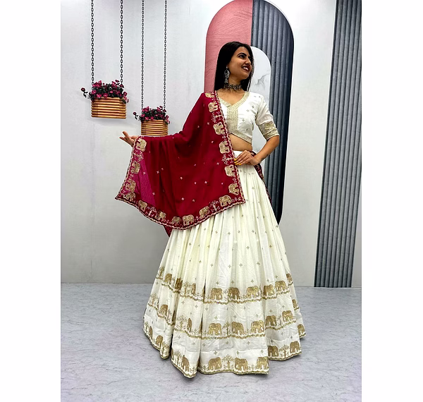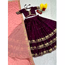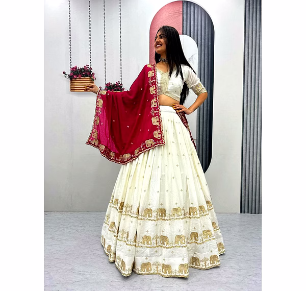 Elevate your ethnic wardrobe with this exquisite Pure Chinon Lehenga Choli set. Featuring intricate embroidery and shimmering sequence work, this fully stitched ensemble offers a seamless blend of luxury and comfort for your next big celebration.