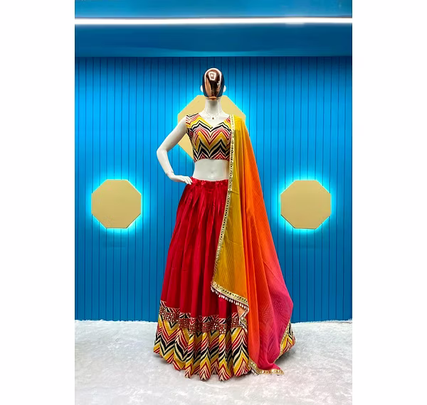 Pure Cotton Lehenga with Print Crochet & Real Mirror Work, Semi Stitched, 4m Flair