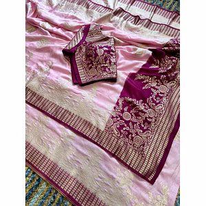Introducing the Pure Dola Silk Saree with Stunning Zari Design - a masterpiece that combines elegance, tradition, and modern flair. Handcrafted with utmost precision, this saree is a true testament to the rich heritage of Indian textiles. Made from pure dola silk, this saree exudes an unmatched grace that will leave you mesmerized. The luxurious fabric drapes effortlessly, embracing your body with a gentle touch. As you glide through the crowd, heads will turn, and eyes will be captivated by the sheer beauty of this saree. The highlight of this exquisite piece is the stunning zari design that adorns its entirety. Intricate and meticulously crafted, the zari work adds a touch of opulence and grandeur to the saree. Each thread of gold and silver intricately weaved together creates a mesmerizing pattern that catches the light and sparkles with every movement. Beyond its captivating aesthetics, this saree offers unmatched comfort and durability. The lightweight dola silk allows for easy movement, while its superior quality ensures that it will be a cherished part of your wardrobe for years to come. Perfect for weddings, festivals, and special occasions, this saree is a true symbol of timeless beauty and elegance. It effortlessly accentuates your natural grace and beauty, making you the center of attention wherever you go. Indulge in the luxury of the Pure Dola Silk Saree with Stunning Zari Design and experience the allure of a bygone era combined with contemporary chic. Step into a world of elegance and make a lasting impression with this exquisite creation.