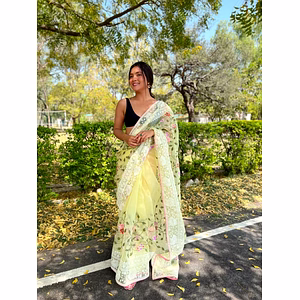 This saree is a testament to skilled craftspeople, featuring detailed embroidery on pure organza silk. The meticulous jall work and chikankari add a symphony of textures and patterns, making it a visual feast for the eyes.
