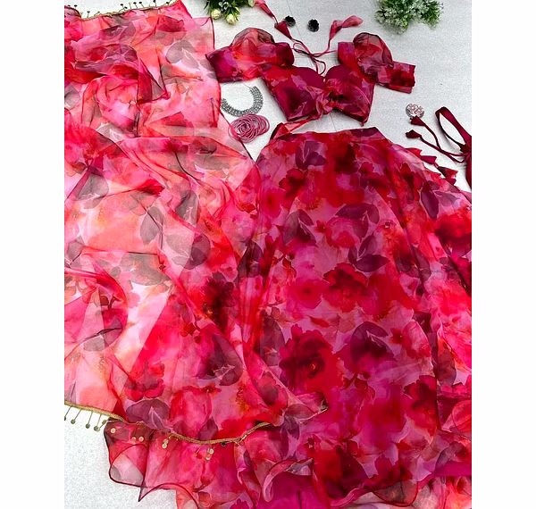 The Pure Silk Organza Lehnga Set with Lace Dupatta is a stunning addition to any fashion-conscious woman's wardrobe. This exquisite lehnga set is made from luxurious pure silk organza fabric, renowned for its lightweight, sheer, and breathable properties. The intricate floral embroidery and delicate lace detailing on the dupatta add a touch of elegance and sophistication to the outfit. The lehnga skirt is flowy, feminine, and flattering, with a comfortable elastic waistband that ensures a perfect fit. The accompanying blouse is equally beautiful, with a flattering round neckline and three-quarter sleeves that add a touch of modesty to the overall look. One of the key benefits of the Pure Silk Organza Lehnga Set with Lace Dupatta is its versatility. It can be worn for a variety of occasions, from weddings and formal events to more casual outings. The lehnga set is available in a range of sizes, making it suitable for women of all shapes and sizes. Another unique selling point of this product is the quality of the craftsmanship and attention to detail. The intricate embroidery and lacework are carefully crafted by skilled artisans, ensuring that every piece is of the highest quality. Overall, the Pure Silk Organza Lehnga Set with Lace Dupatta is a timeless and sophisticated outfit that is sure to turn heads wherever you go. Its combination of luxurious fabric, elegant design, and versatile styling make it a must-have for any stylish woman looking to make a statement.