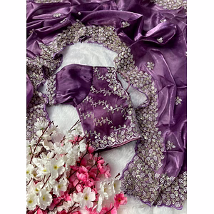 Introducing our exquisite collection of pure soft zimmy choo silk sarees, a perfect blend of elegance and style. With its stunning 3 mm sequence work and intricate work border, this saree is designed to make you stand out in any occasion. Crafted with utmost precision, these sarees are made from high-quality zimmy choo silk, ensuring a luxurious feel against your skin. The soft and smooth fabric drapes effortlessly, giving you a graceful silhouette. Paired with the saree is a fully stitched blouse made from the same zimmy choo fabric. The blouse features beautiful embroidery work and is adorned with a lovely latkan, adding a touch of glamour to your look. The blouse also comes with extra margin, allowing for a perfect fit for sizes up to 42". Whether it's a wedding, a festive celebration, or a special event, our zimmy choo silk sarees are sure to make a statement. The combination of the intricate sequence work, the mesmerizing work border, and the exquisite embroidery on the blouse, makes this ensemble a true masterpiece. Experience the luxury and beauty of our zimmy choo silk sarees, and step into a world of elegance and glamour. Each saree is meticulously crafted to perfection, with attention to detail that is unmatched. Embrace the timeless charm of these sarees and make a lasting impression wherever you go.