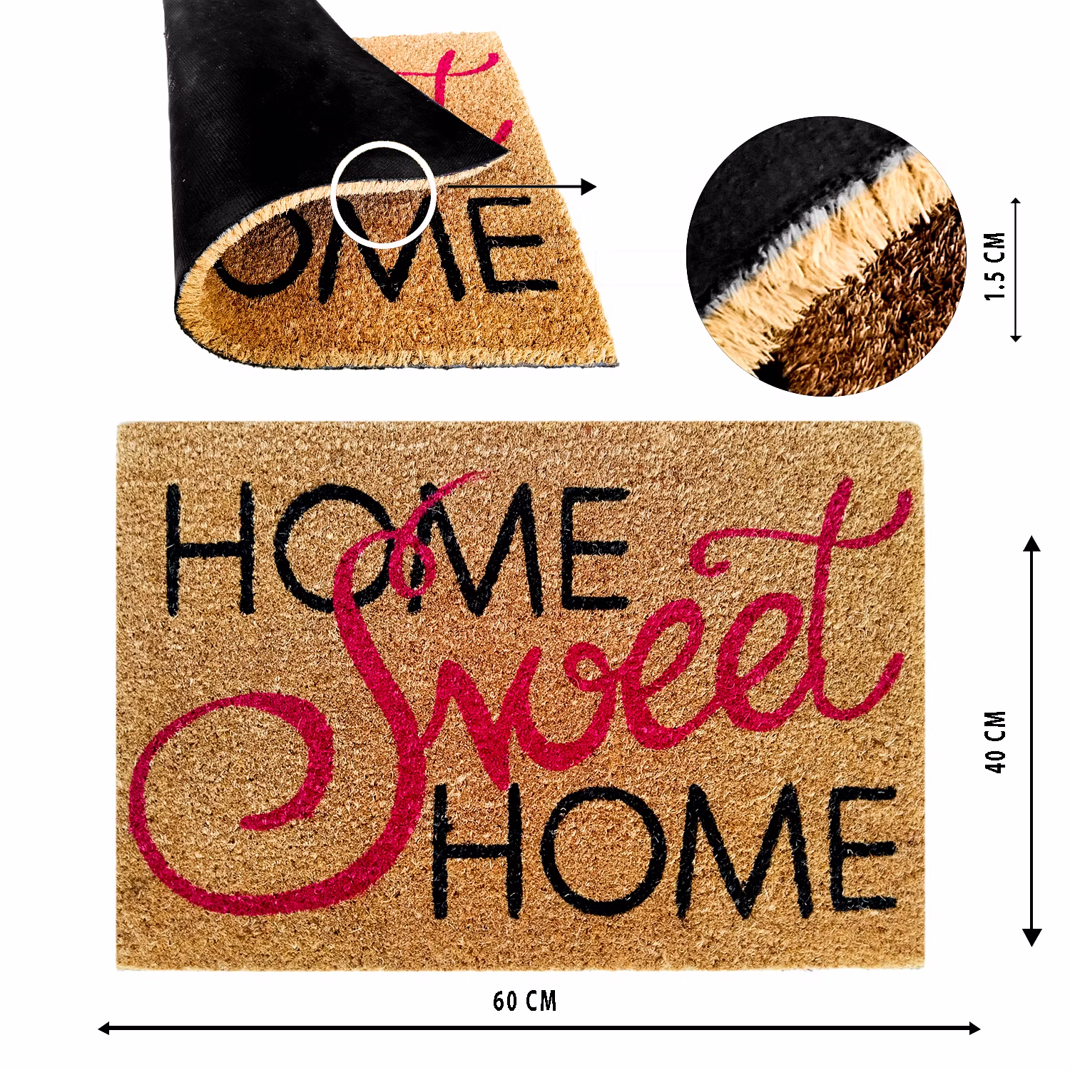 • Material used: PRP PVC COIR sweet home Door Mat, Color: Black and red, Size: Standard 40X60 C M With SIZE 1.5 C M pile height