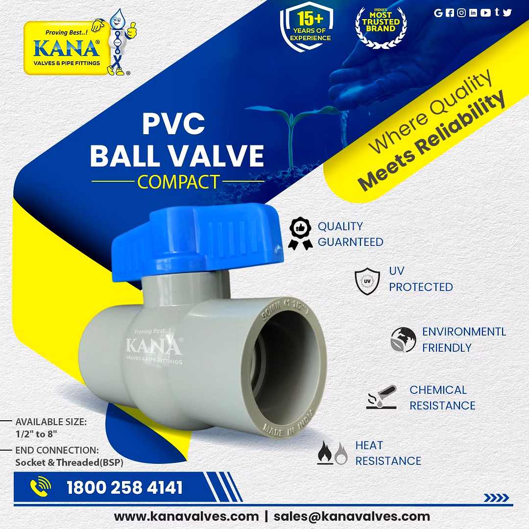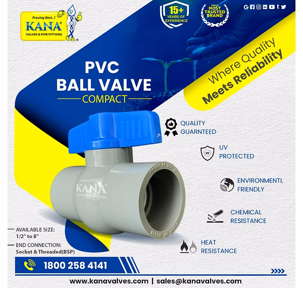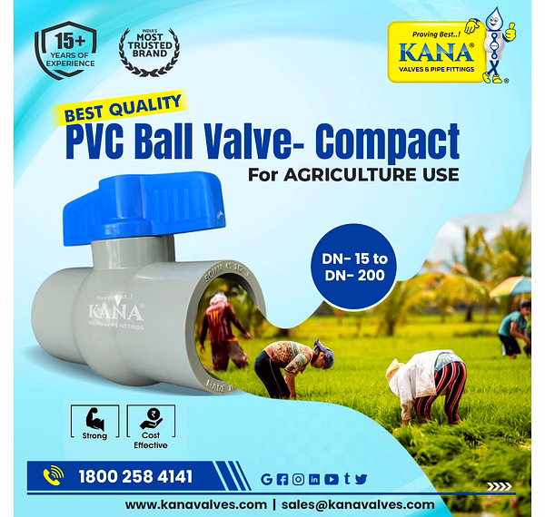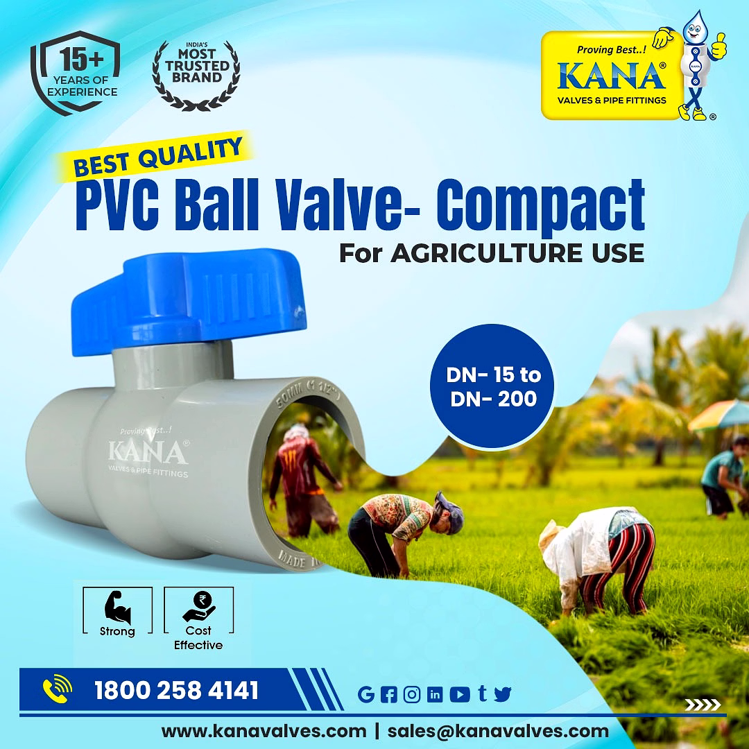 KANA PVC Compact Ball Valves are precision-engineered using high-grade PVC (Polyvinyl Chloride) material, ensuring excellent durability, chemical resistance, and leak-free performance in both agricultural and plumbing applications.