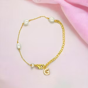 R Alphabetic Mother of Pearl Bracelet Product code:JPJAN-24-110 Pearl Shape:Oval Pearl Size:4-5 MM Pearl color:White Pearl quality:AA Pearl type:Freshwater Pearls Stone Name:Freshwater Pearls Base Metal:Silver Alloy with Gold Plating Brand:Sri Jagdamba Pearls