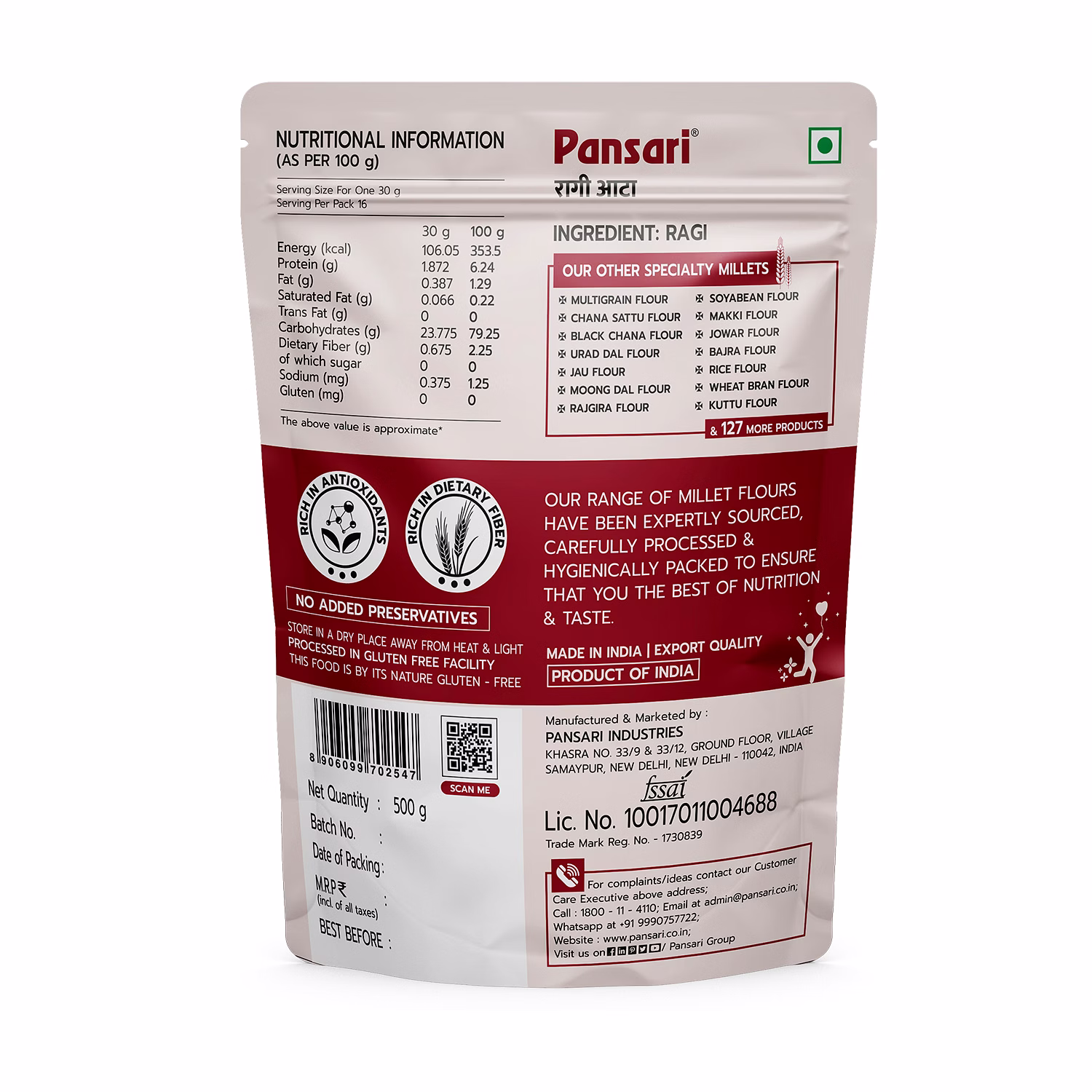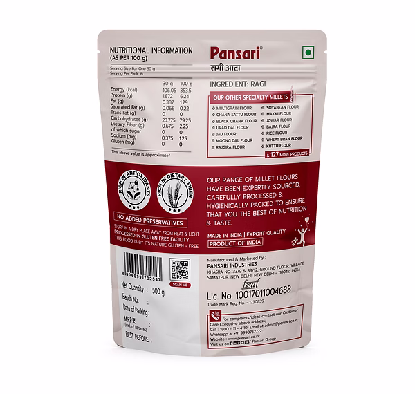 Being naturally gluten-free, ragi flour is also suitable for people with gluten intolerance. It is processed under hygienic conditions to retain its natural nutrients and freshness, making it ideal for both household use and bulk supply.