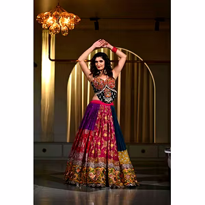Indulge in the craftsmanship of the Navratri special lehenga choli, meticulously designed to offer both style and comfort. The high-quality fabric ensures a luxurious feel, allowing you to move with grace and confidence throughout the celebrations.