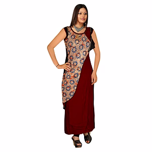 This Readymade Attire With Fabric Button, Side Dori, Stone, Zari, Crafted In Round Neck and Sleeveless Wash Care : Dry Clean only Material : 14Kg Rayon Do note: The Length may vary upto 2 inches. Bottom and Accessories shown in the image are for presentation purposes only. (Slight variation in actual color vs. image is possible).