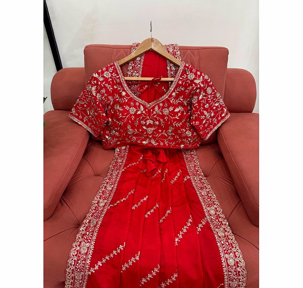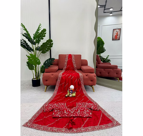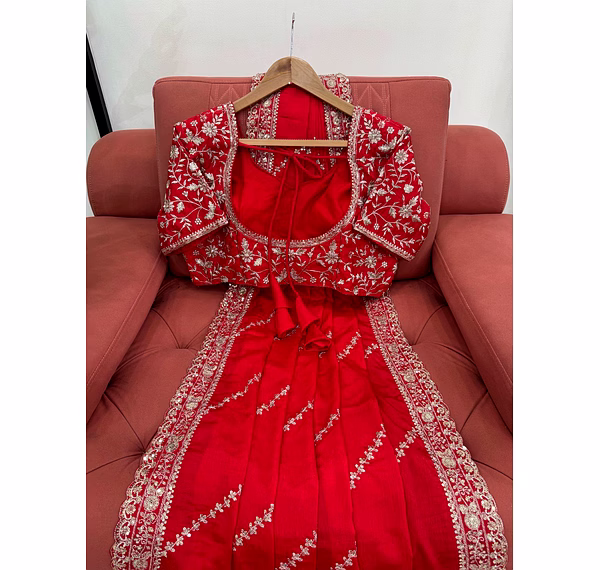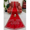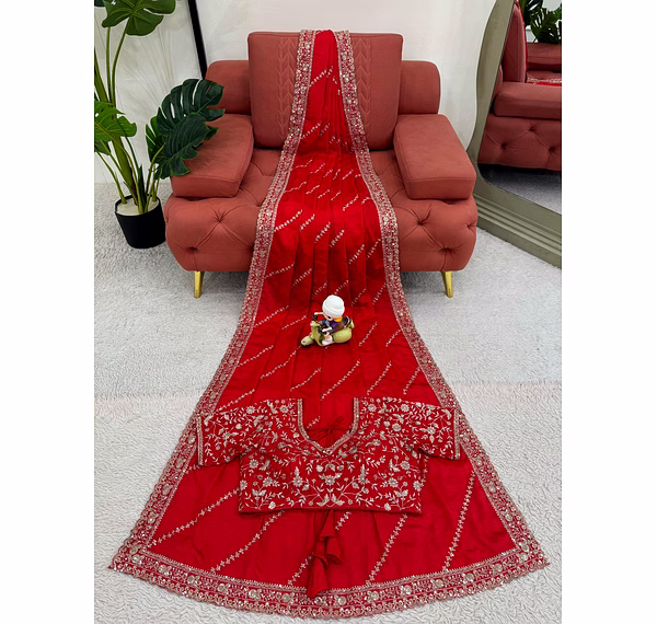 Make a bold and graceful statement with our Red Chinon Silk Saree with Sequence Work, designed for women who love timeless elegance with a modern shimmer. The rich red hue symbolizes celebration and confidence, making it a perfect choice for weddings, parties, and festive occasions.