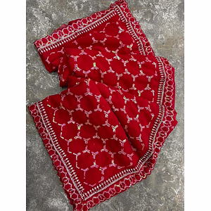 Indulge in the timeless elegance of our Red Georgette Saree with stunning embroidery work that adds a touch of sophistication to your wardrobe. Crafted with precision and care, this saree exudes grace and charm, perfect for any occasion.