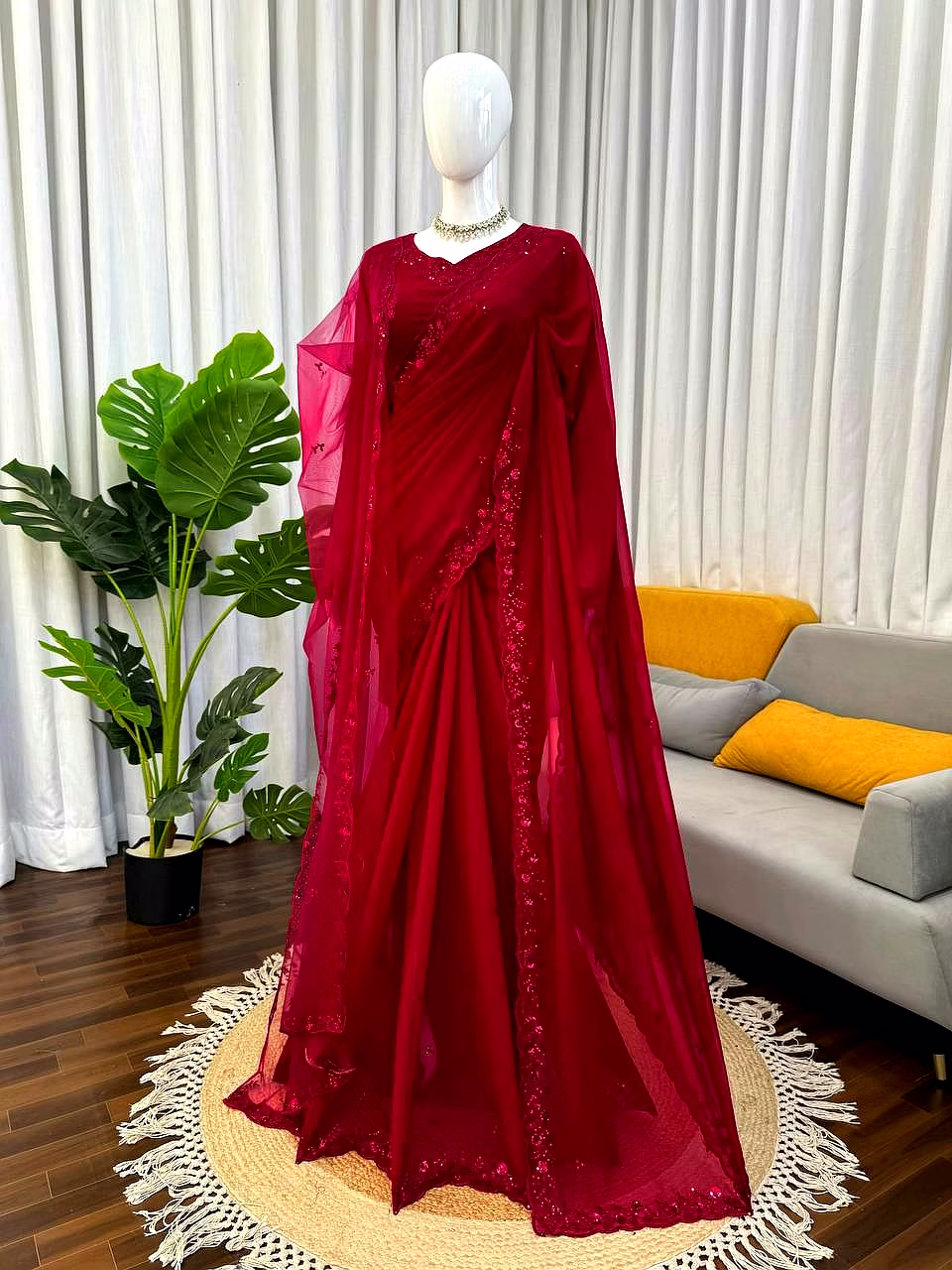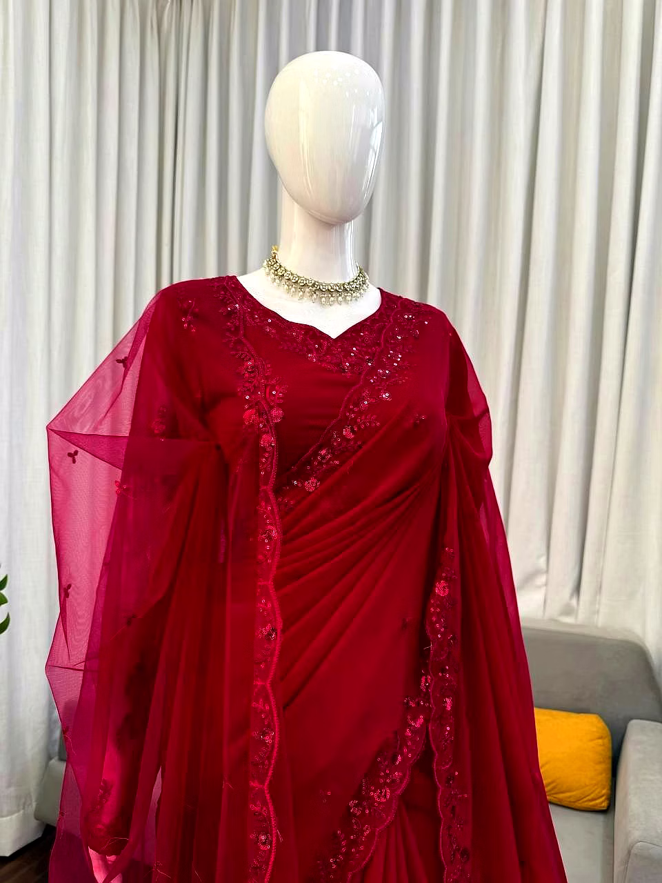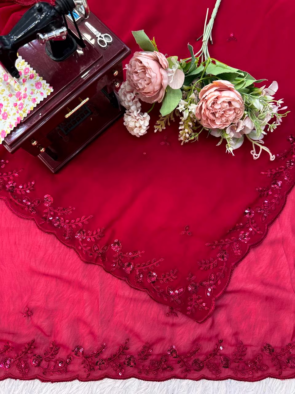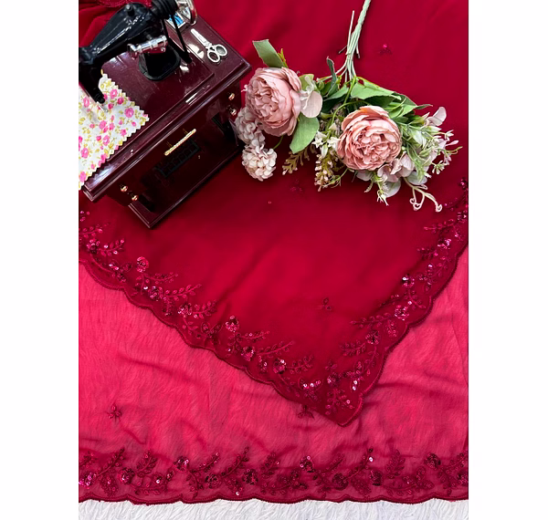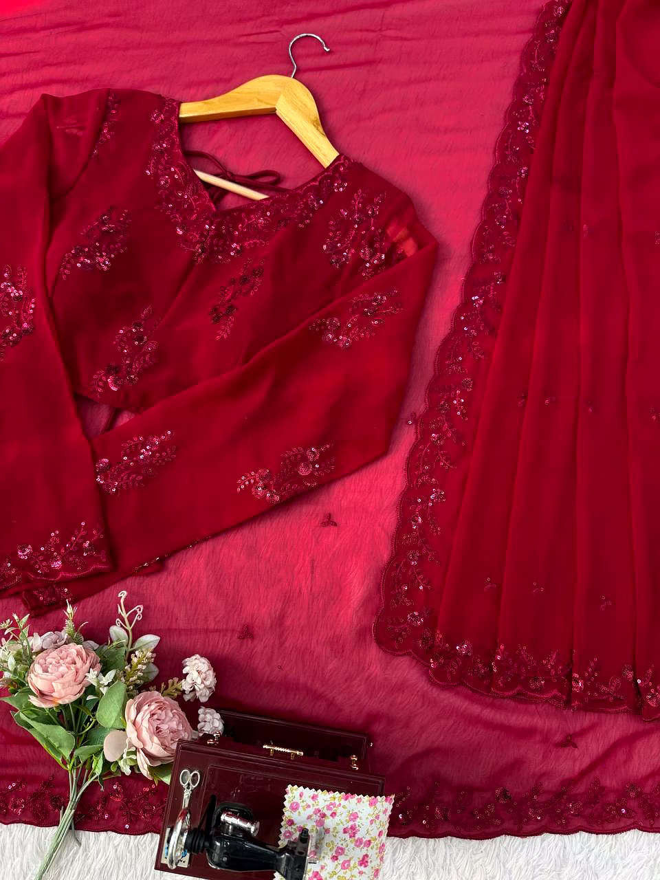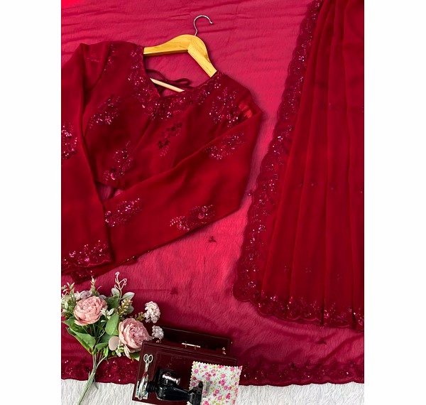 Elevate your style with our stunning Red Georgette Saree adorned with intricate Sequence Work. This elegant saree blends traditional charm with contemporary flair.