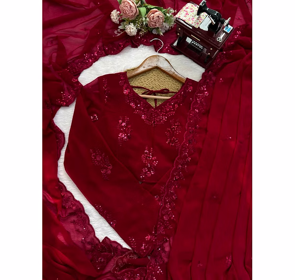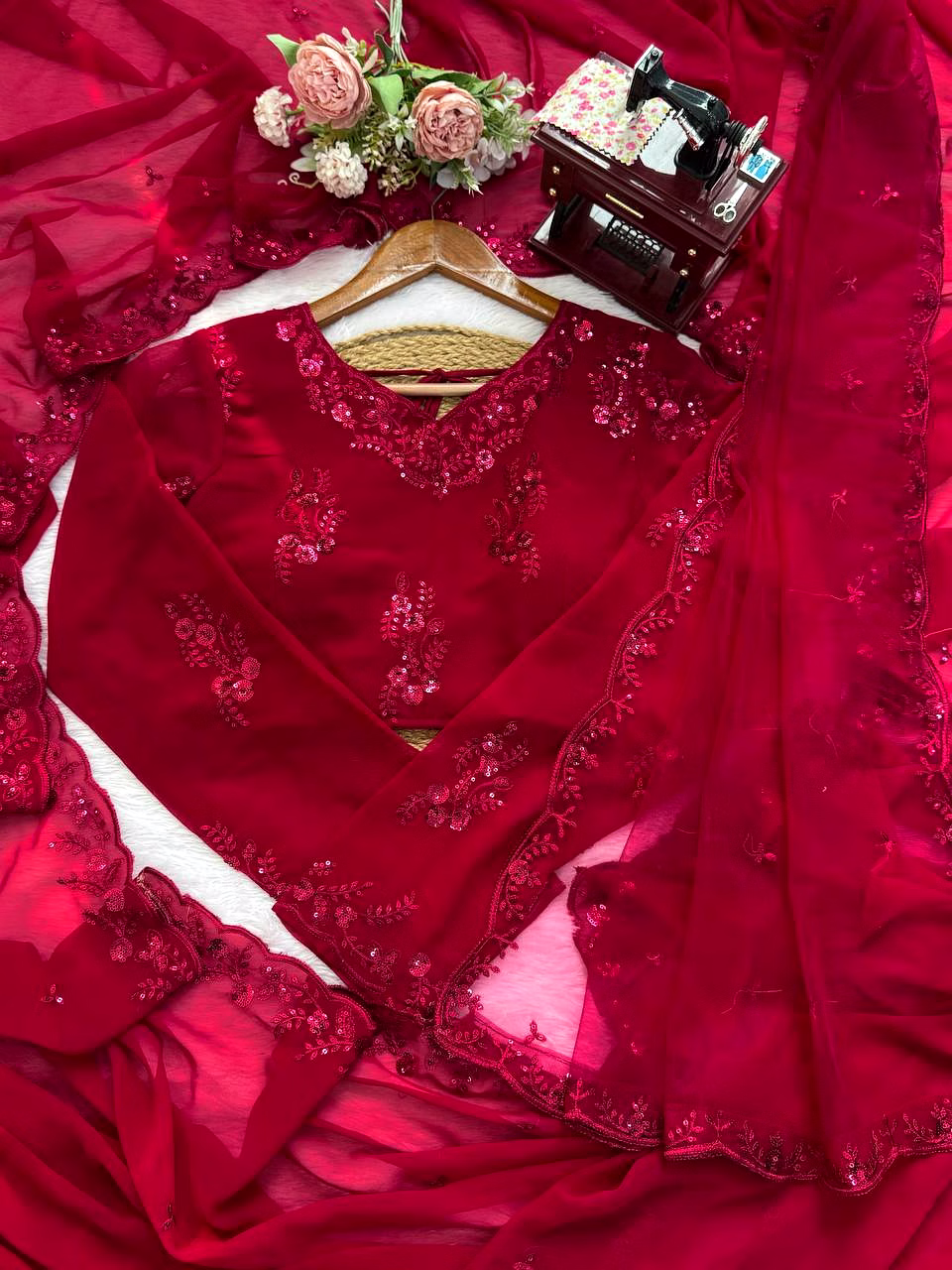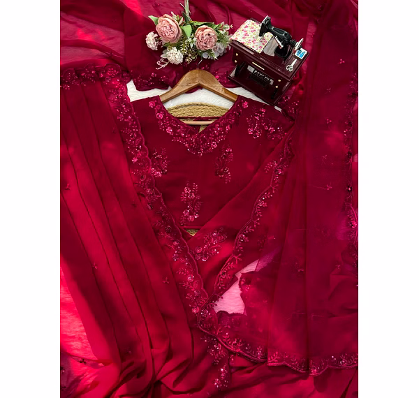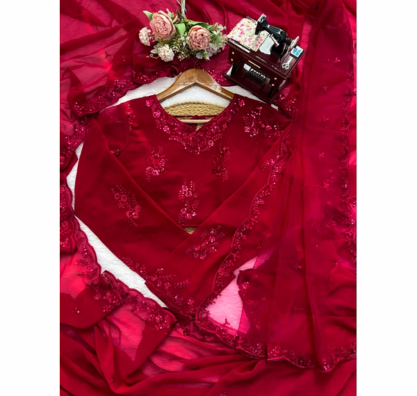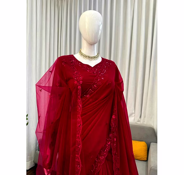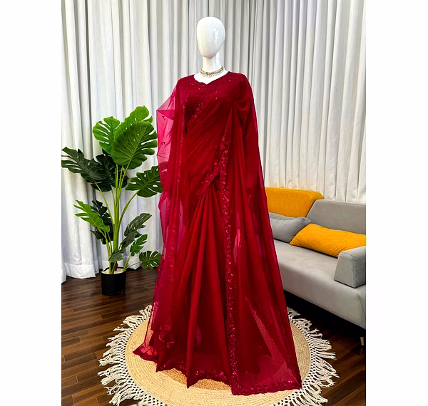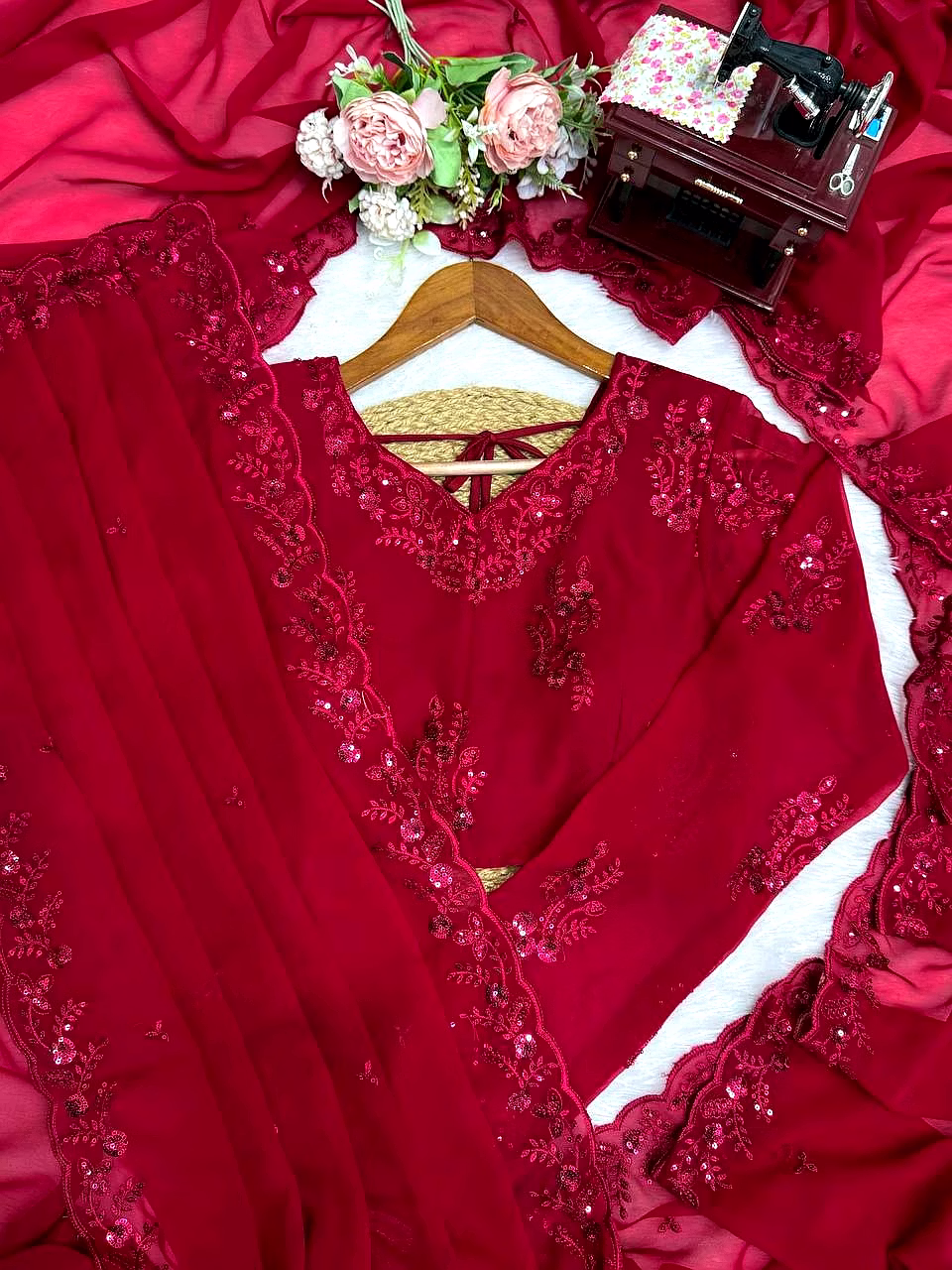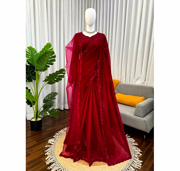 Elevate your style with our stunning Red Georgette Saree adorned with intricate Sequence Work. This elegant saree blends traditional charm with contemporary flair.
