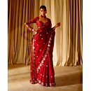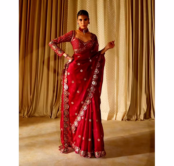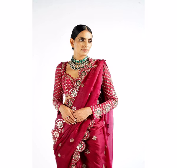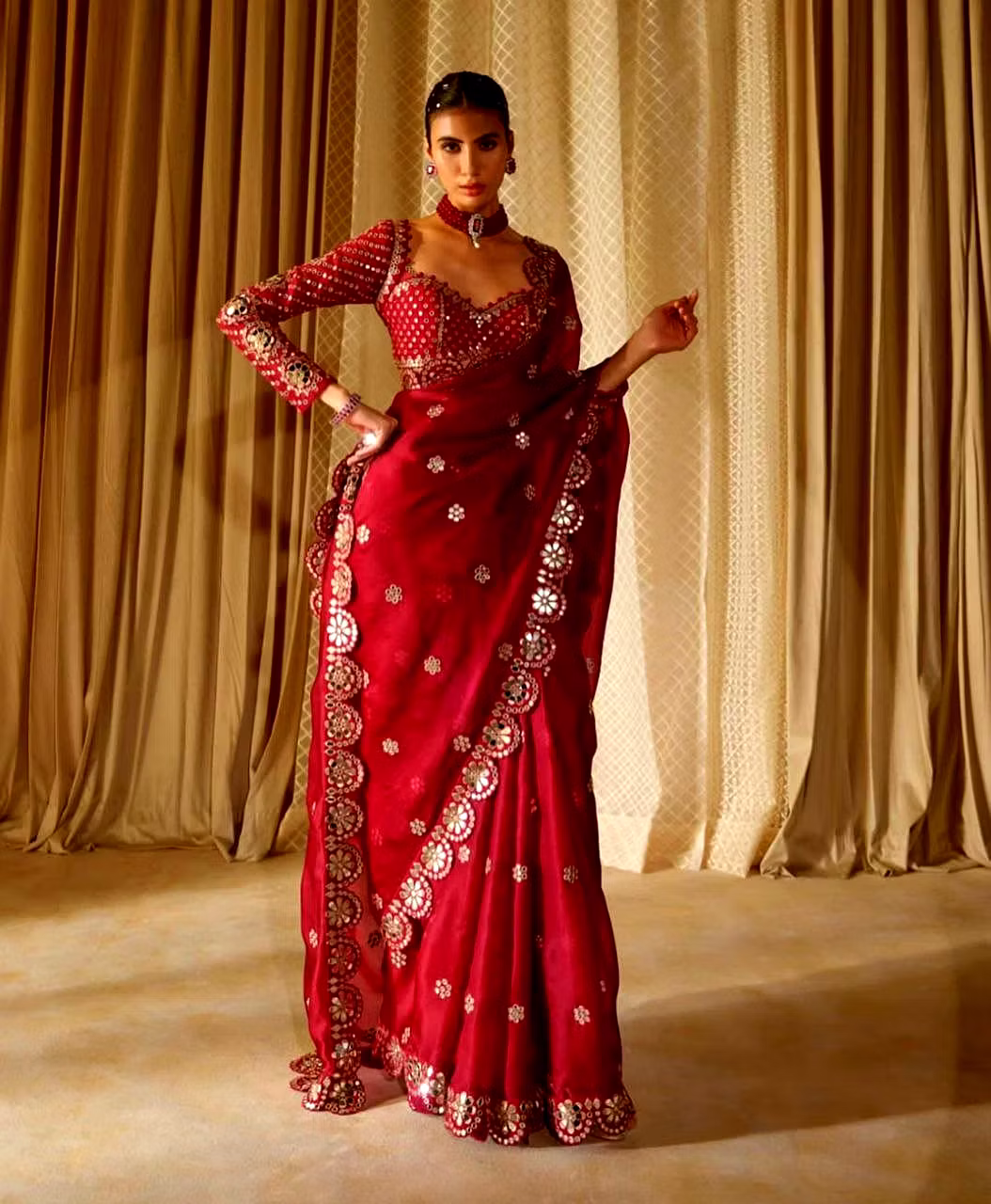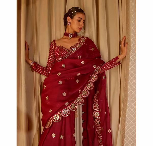 Red never goes out of fashion, especially when paired with the delicate artistry of mirror work. Our georgette saree is a blend of tradition and sophistication, perfect for special occasions.