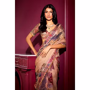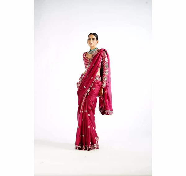 Each mirror meticulously hand-sewn onto the saree reflects the craftsmanship and dedication that goes into making this attire a masterpiece. Stand out with a piece that tells a story of skill and artistry.