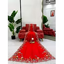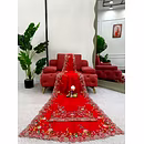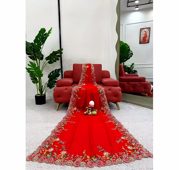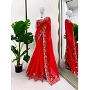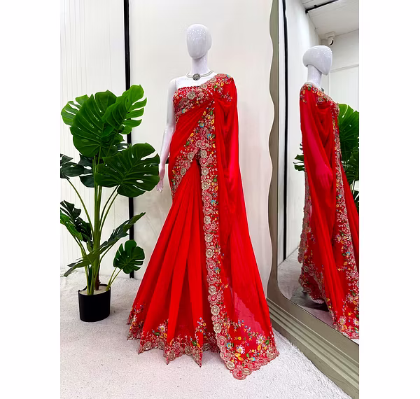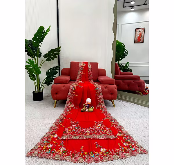 The Red Georgette Saree is meticulously crafted with high-quality georgette fabric and adorned with beautiful thread embroidery and shimmering sequins, adding a touch of sophistication to your look.