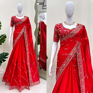 Drape yourself in elegance with the Red Saree Karwa Chauth, crafted from Japan Satin Silk. Radiate festive charm with this traditional masterpiece.