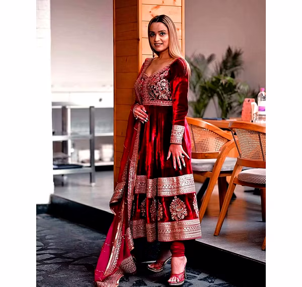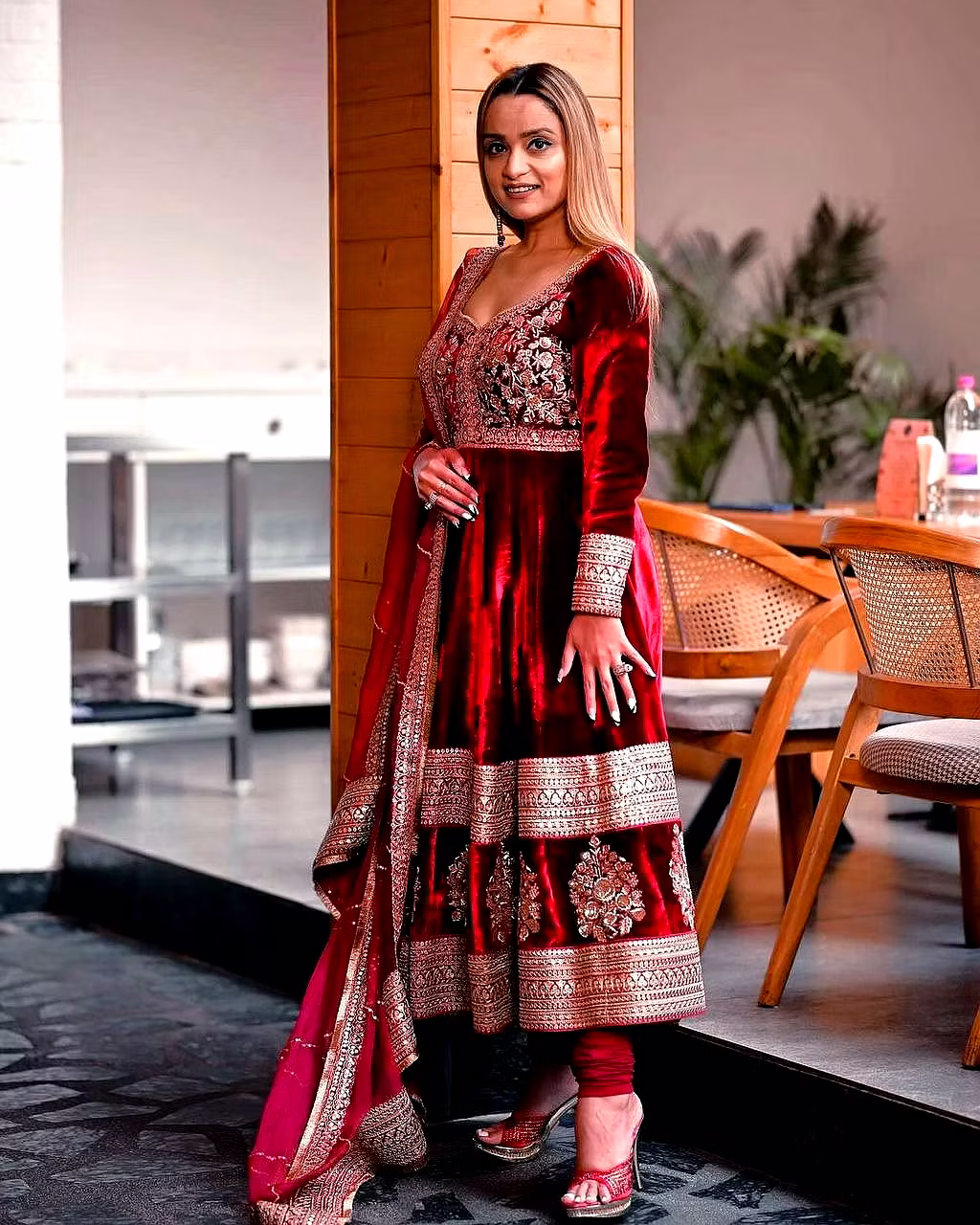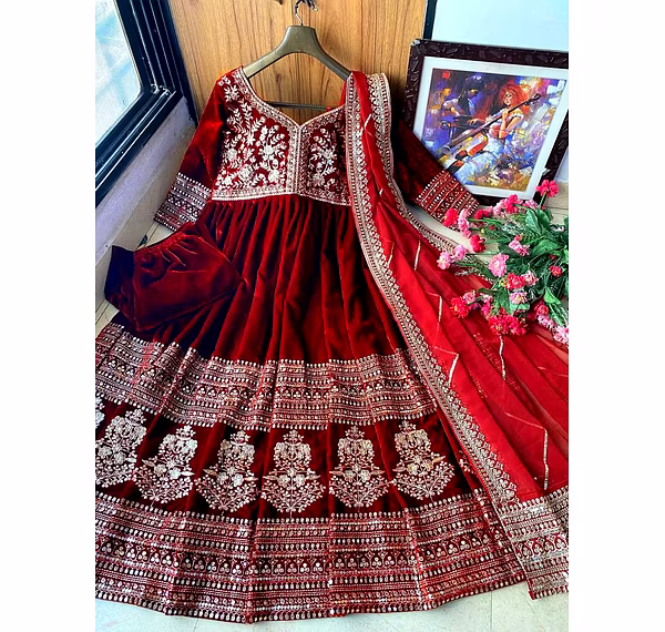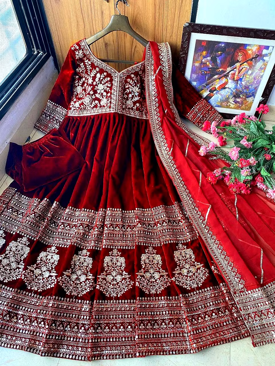 Elevate your presence with the Red Velvet Designer Anarkali Gown, a symbol of power, elegance, and unforgettable style. Crafted from premium velvet with meticulous detailing, this gown is perfect for weddings, festivals, and celebrations.
