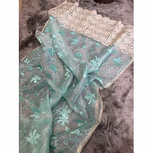 Introducing our refined organza silk saree, a masterpiece of elegance and craftsmanship. This exquisite saree is adorned with intricate chikankari embroidery, adding a touch of opulence to its already mesmerizing charm. Crafted with utmost precision, this saree showcases the rich heritage of Indian textiles. The lightweight and breathable organza silk fabric make it a perfect choice for any occasion, ensuring comfort and grace all day long. The chikankari embroidery, a traditional art form originating from Lucknow, brings an ethereal beauty to this saree. Each delicate stitch is a testimony to the skill and dedication of our master artisans. The intricate floral motifs and intricate patterns are meticulously handcrafted, creating a captivating visual delight. Beyond its aesthetics, this saree also offers practicality and versatility. The soft and flowing fabric drapes elegantly around the body, flattering every silhouette. It can be effortlessly styled for both formal events and casual gatherings, making it a timeless addition to your wardrobe. With our refined organza silk saree, you can be assured of unmatched quality and attention to detail. We take pride in our commitment to delivering products that exude sophistication and refinement. Make a statement with this exquisite saree that seamlessly blends tradition and contemporary fashion. Embrace the beauty of chikankari embroidery and experience the sheer luxury of our refined organza silk saree. Elevate your style and capture the essence of elegance with this stunning piece.