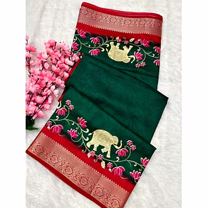 This stunning saree is made from rich kotta silk, featuring a breathtaking digital print that is sure to turn heads. The pure zari border and pallu latkan add an extra touch of elegance to this already exquisite design. At a length of 5.50 meters, this saree is perfect for any occasion, whether it be a formal event or a casual outing. The matching blouse, made from the same high-quality kotta silk and adorned with the same stunning digital print, adds the perfect finishing touch to this already stunning ensemble. Not only is this saree beautiful to look at, but it is also incredibly comfortable to wear. The rich kotta silk fabric is soft and breathable, allowing you to move and dance with ease. This saree is the perfect combination of classic and contemporary design. The digital print gives it a modern edge, while the pure zari border and pallu latkan provide a traditional touch. Investing in this saree is an investment in quality. The high-quality kotta silk fabric ensures that this saree will last for years to come. In short, this saree is the perfect choice for anyone looking for a unique, high-quality, and timeless addition to their wardrobe. Don't miss out on the opportunity to own this stunning piece of fashion.