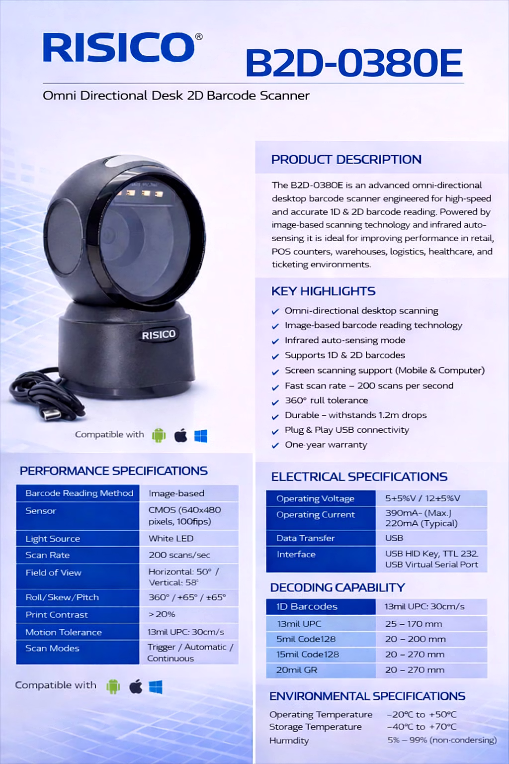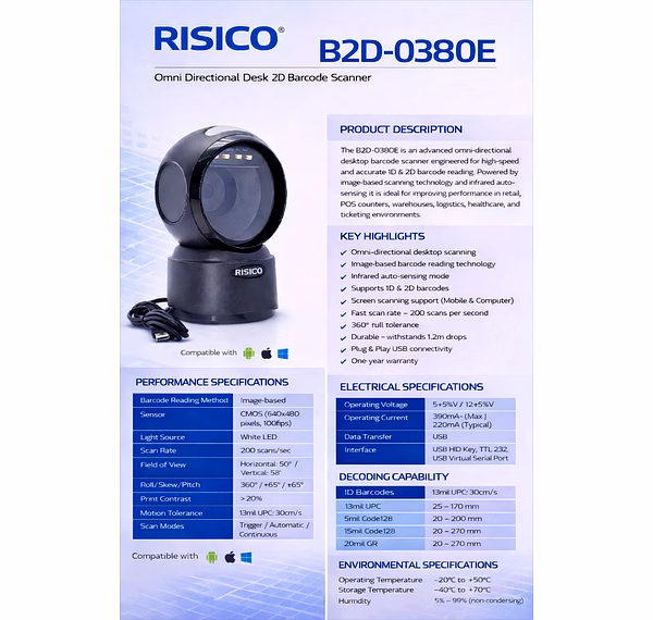 Experience reliable and efficient scanning performance with the Risico B2D O380 Barcode Scanner. Designed for durability, this scanner is a valuable addition to any retail or warehouse environment.