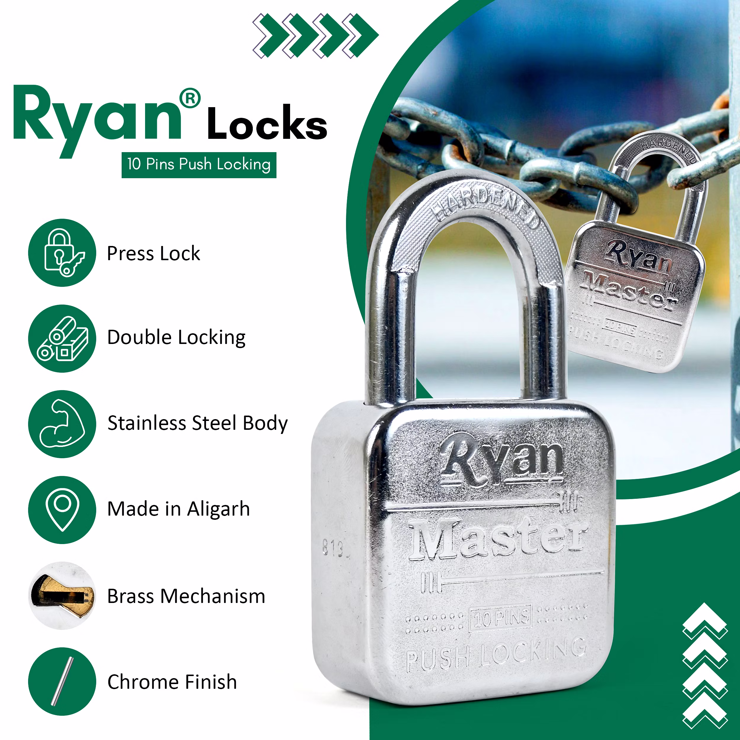 Protect your valuables with the Ryan Master 65mm Padlock. Featuring a 100% steel body, 14 pin double locking system, and 4 ultra brass keys, this chrome-plated padlock ensures top-level security and durability.
