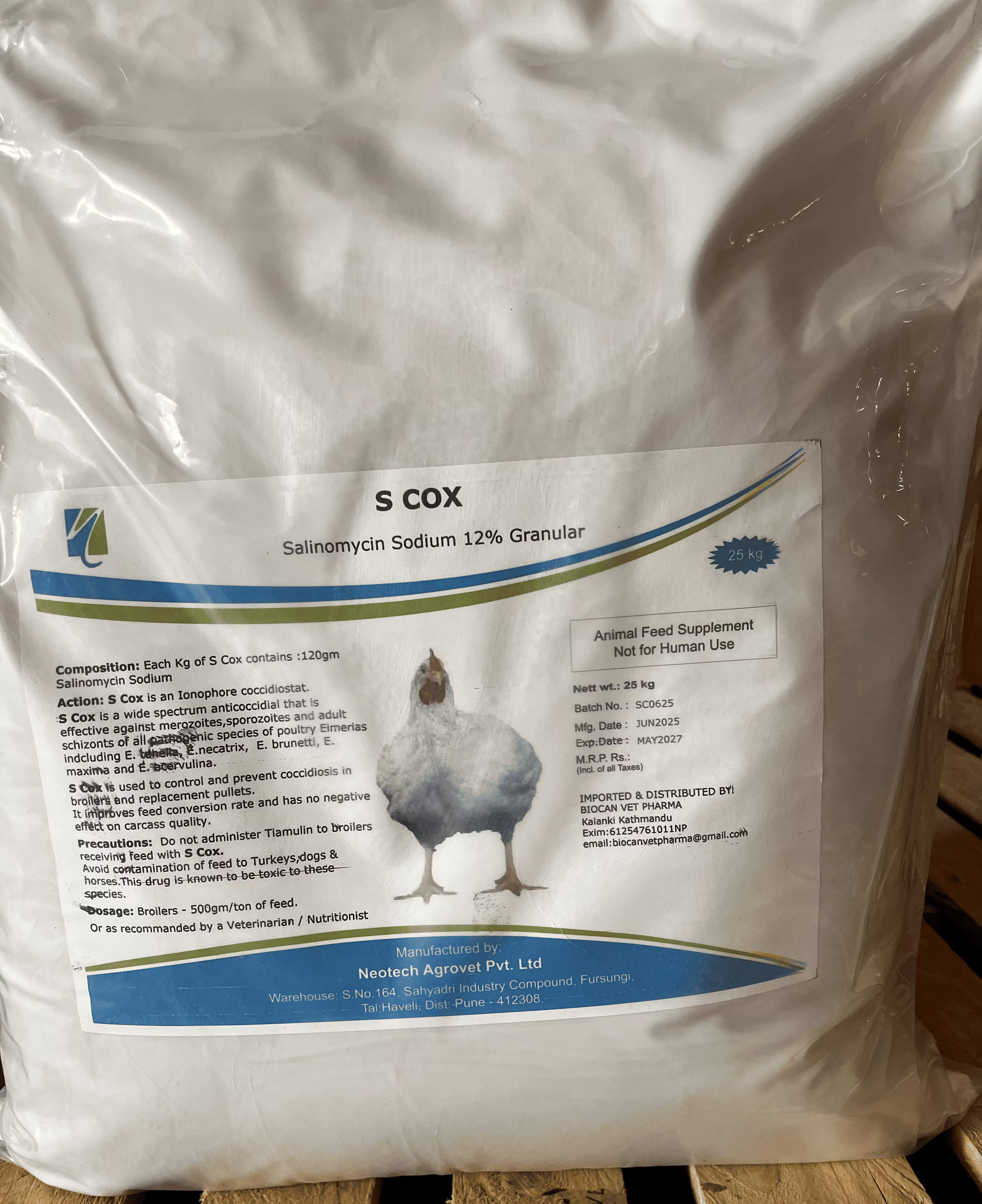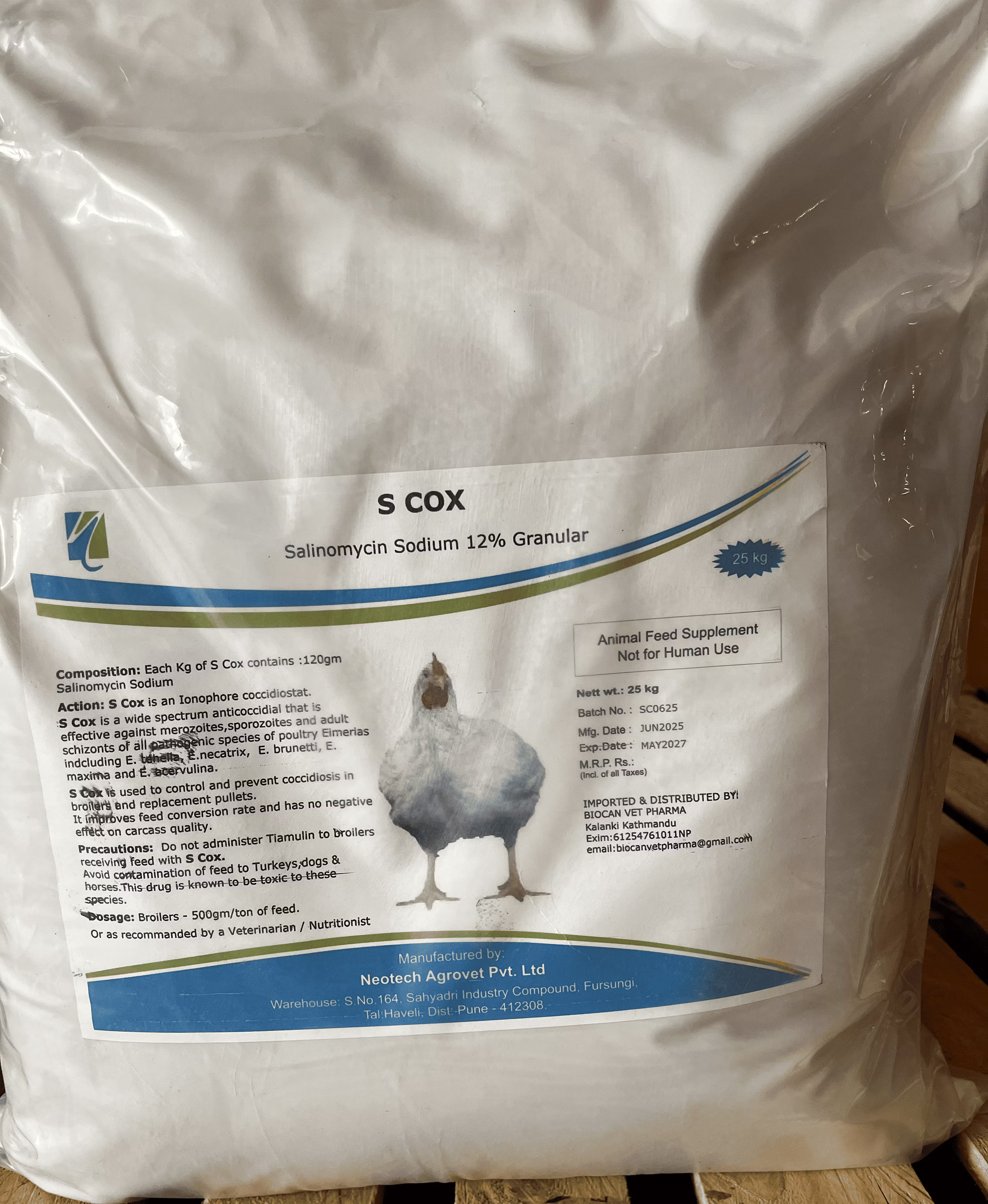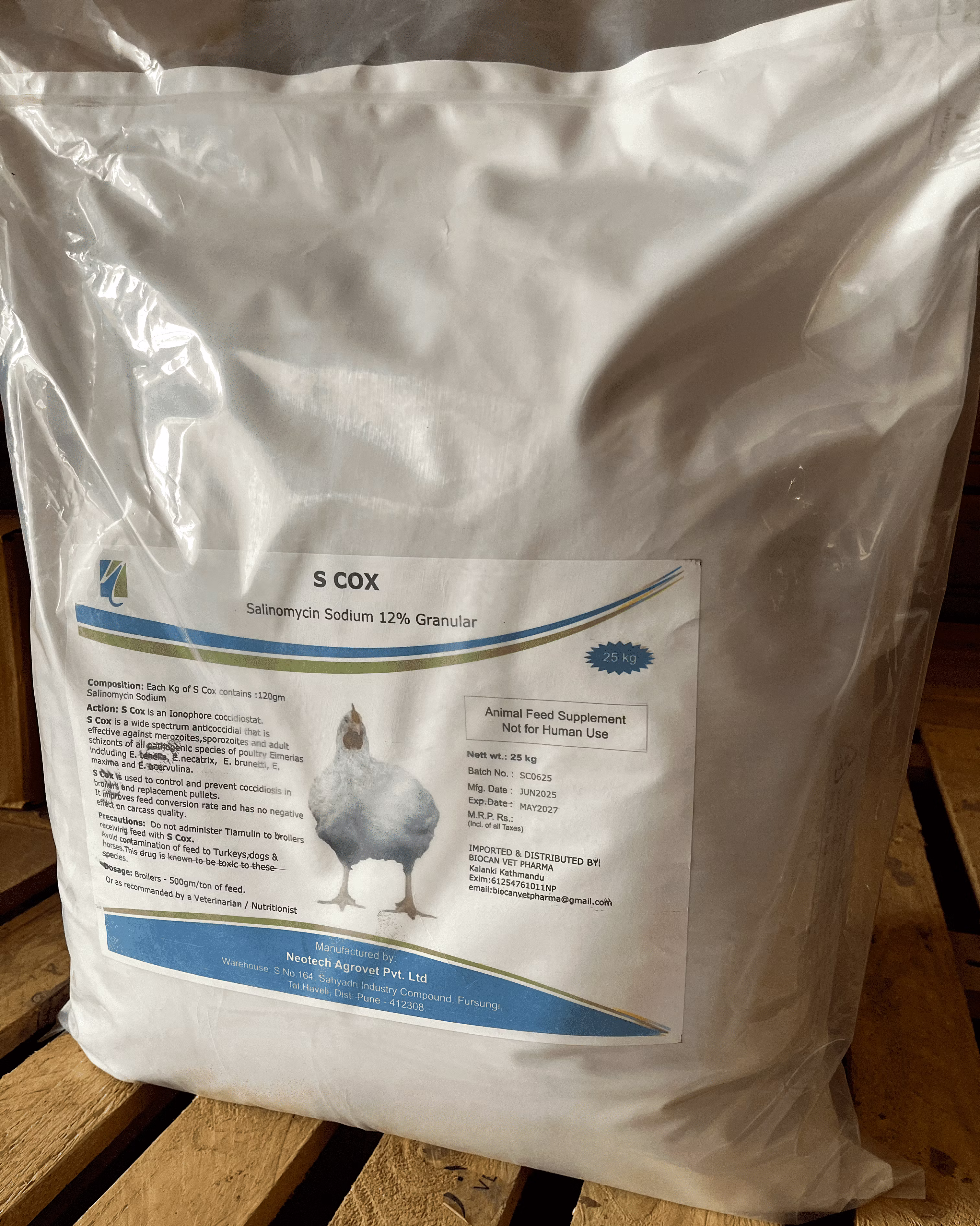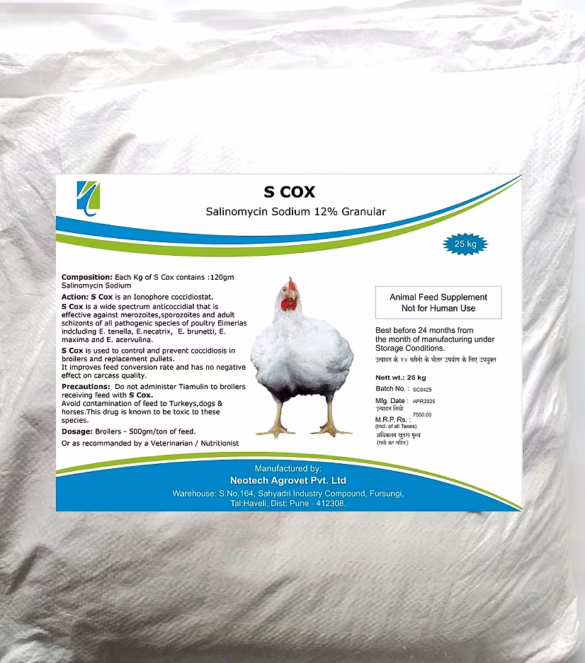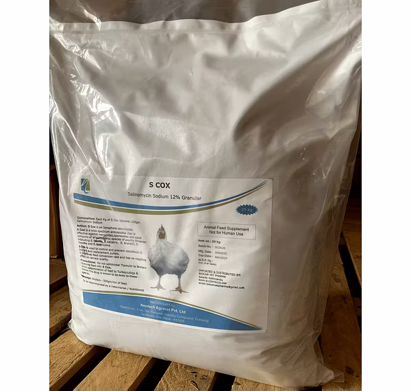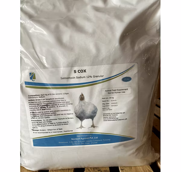 S COX 12% - Salinomycin 12% is a coccidiostat commonly used in poultry feed to prevent and control coccidiosis, an intestinal disease caused by protozoa. It's used at a rate of 500 grams per ton of feed, often from the first day of life for broilers, and is typically withdrawn 5 days before slaughter. Coccidiosis Prevention: Salinomycin 12% helps prevent coccidiosis in poultry, a common parasitic infection. Broiler Chickens: It's frequently used in broiler chickens from the first day of life to prevent coccidiosis.