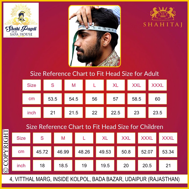 Art and craft has been an integral part of Indian ethos since ages. It is this ancient tradition and heritage that we at Shahi Taj strive to keep alive. A pioneer in Indian traditional head accessory industry, we not only cater the Indian domestic market but is also leading exporter of turban, safa, pheta and pagdi. We have years of experience in manufacturing traditional ethnic turbans which are perfect for all occasions. We design and create as per your outfit. This product is beautifully crafted using superior quality thread.
