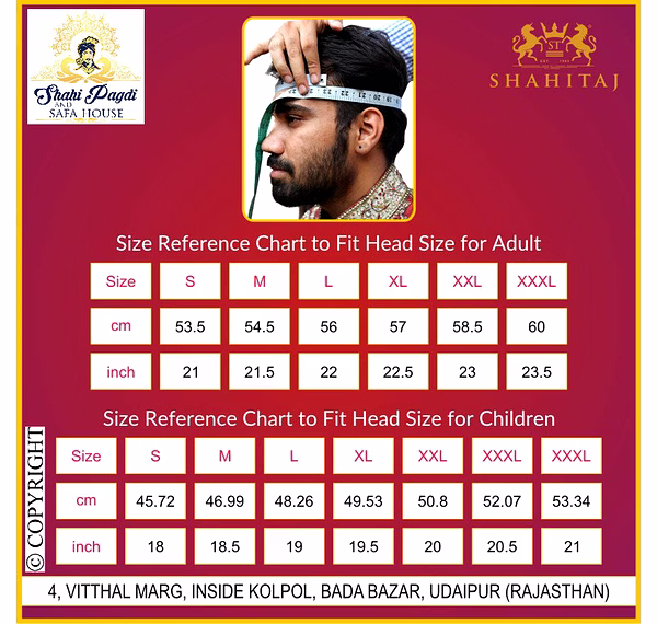 Art and craft has been an integral part of Indian ethos since ages. It is this ancient tradition and heritage that we at Shahi Taj strive to keep alive. A pioneer in Indian traditional head accessory industry, we not only cater the Indian domestic market but is also leading exporter of turban, safa, pheta and pagdi. We have years of experience in manufacturing traditional ethnic turbans which are perfect for all occasions. We design and create as per your outfit. This product is beautifully crafted using superior quality thread.
