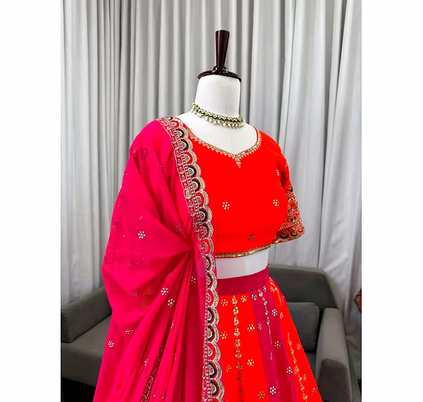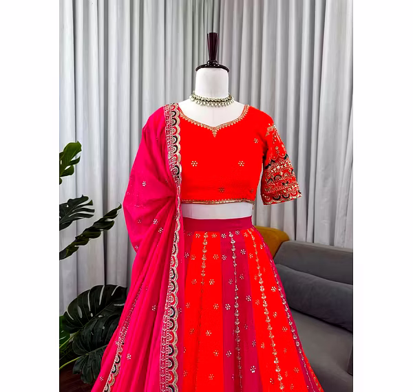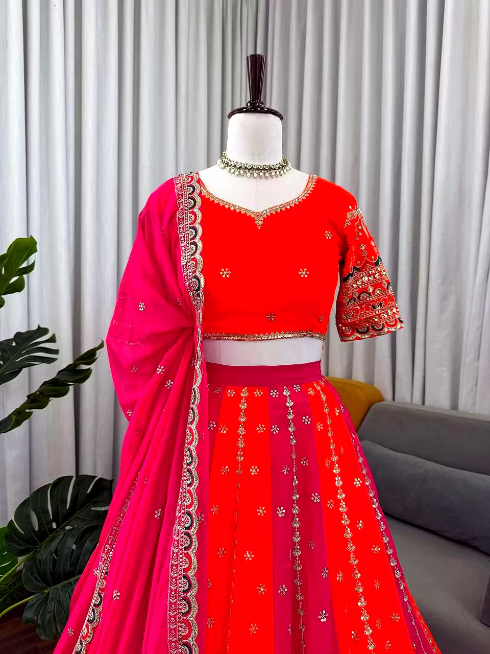 Embrace the enchantment of the night with the Sangeet Special Georgette Thread With Sequence Work Lehenga Choli, a blend of radiance, elegance, and contemporary Indian style.