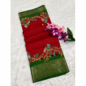 Introducing the stunning BSY Dola Silk Saree with a unique blend of traditional and contemporary design. This saree is the perfect pick for any occasion with its intricate Kasab Zari Jacquard Border Pattern that adds a touch of elegance and glamour. The saree boasts of a pure Mangalgiri Elephant Print with Self Kalamkari Print all over the body, making it a spectacular sight to behold. Crafted to perfection, this saree is unstitched and comes with a cut of 6.30m, providing ample space for customization to suit your personal style. The Self Kalamkari Print All Over Blouse is the perfect complement to this beautiful saree, adding a touch of sophistication and class. The saree is made from high-quality materials that ensure durability and comfort, making it a perfect blend of style and comfort. The unique fusion of traditional design with modern trends makes this saree a must-have in your wardrobe. Whether you want to make a statement at a wedding or look your best at a festive occasion, this saree is the perfect choice. With its unique design and unparalleled quality, the BSY Dola Silk Saree is sure to turn heads and create an impression that lasts. In conclusion, if you're looking for a saree that stands out from the crowd and makes you feel confident and beautiful, the BSY Dola Silk Saree is the perfect choice. So why wait? Get your hands on this amazing saree today and experience the magic for yourself!