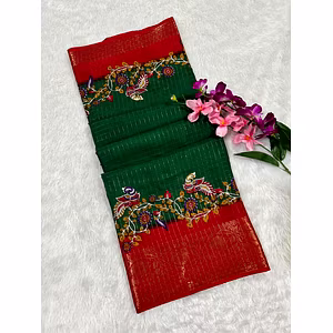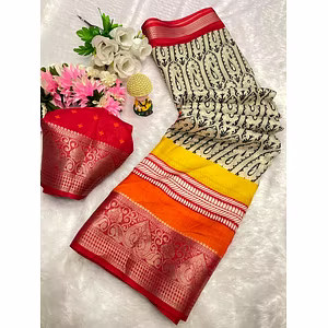 Introducing the stunning BSY Dola Silk Saree with a unique blend of traditional and contemporary design. This saree is the perfect pick for any occasion with its intricate Kasab Zari Jacquard Border Pattern that adds a touch of elegance and glamour. The saree boasts of a pure Mangalgiri Elephant Print with Self Kalamkari Print all over the body, making it a spectacular sight to behold. Crafted to perfection, this saree is unstitched and comes with a cut of 6.30m, providing ample space for customization to suit your personal style. The Self Kalamkari Print All Over Blouse is the perfect complement to this beautiful saree, adding a touch of sophistication and class. The saree is made from high-quality materials that ensure durability and comfort, making it a perfect blend of style and comfort. The unique fusion of traditional design with modern trends makes this saree a must-have in your wardrobe. Whether you want to make a statement at a wedding or look your best at a festive occasion, this saree is the perfect choice. With its unique design and unparalleled quality, the BSY Dola Silk Saree is sure to turn heads and create an impression that lasts. In conclusion, if you're looking for a saree that stands out from the crowd and makes you feel confident and beautiful, the BSY Dola Silk Saree is the perfect choice. So why wait? Get your hands on this amazing saree today and experience the magic for yourself!