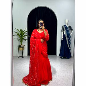 Introducing our stunning Lehenga Saree, a perfect blend of elegance and style. Crafted with utmost precision, this enchanting piece is designed to make you stand out on any occasion. Made from high-quality satin and georgette fabric, our Lehenga Saree exudes a luxurious feel and offers exceptional comfort. The 3-meter flair and 42-inch waist ensure a flattering fit for all body types. The pallu, attached to the lehenga, adds an exquisite touch, draping gracefully as you move. The blouse, made from georgette fabric, is adorned with intricate embroidery on the front and back, giving it a regal and eye-catching appeal. The full sleeves enhance the overall design, adding a touch of glamour to your ensemble. With a stitch size of up to 42 inches, the blouse offers a perfect fit. Our Lehenga Saree is not just a garment; it is a statement. It effortlessly combines traditional charm with contemporary fashion, making it the ideal choice for weddings, parties, and other special occasions. The exquisite craftsmanship, attention to detail, and premium quality materials ensure that you look and feel your best. Whether you are the bride, a bridesmaid, or a guest, our Lehenga Saree will make you the center of attention, turning heads wherever you go. Embrace the elegance, grace, and confidence that our Lehenga Saree brings, and make a lasting impression. Elevate your style with our Lehenga Saree and experience the perfect amalgamation of tradition and modernity. Discover the magic of our exquisite design and be ready to make a statement.