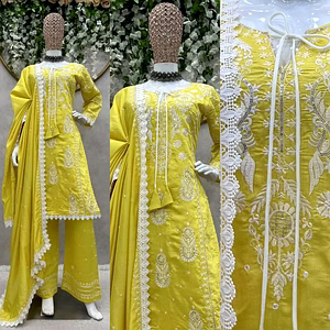 The Satin Silk Koti Fabric Set with Micro Cotton Top and Embroidery Mirror Work is an exquisite ensemble that seamlessly blends traditional elegance with contemporary fashion. The set includes a rich satin silk koti, a micro cotton top, and intricate embroidery featuring mirror work, making it a versatile and stylish choice for various occasions. The satin silk koti is the highlight of this ensemble, crafted with meticulous attention to detail. Satin silk, known for its luxurious sheen and smooth texture, drapes beautifully over the body, providing a sophisticated and elegant look. The fabric is lightweight yet durable, ensuring comfort and longevity. The koti is designed to enhance the overall outfit with its structured yet graceful silhouette, which flatters all body types. The sophisticated design allows it to be worn for formal events, festive occasions, or even as a statement piece for upscale casual outings. Accompanying the satin silk koti is a micro cotton top that offers the perfect balance of comfort and style. Micro cotton is renowned for its softness, breathability, and lightweight nature, making it ideal for all-day wear. This top is designed to complement the luxurious satin silk koti while providing a comfortable base layer. The simple yet elegant design ensures that it does not overshadow the ornate koti, instead enhancing its beauty. The pièce de résistance of this fabric set is the intricate embroidery mirror work that adorns the satin silk koti. Each mirror is carefully placed and stitched by skilled artisans, creating a mesmerizing pattern that catches the light and dazzles the eye. The embroidery adds a touch of traditional charm to the ensemble, paying homage to age-old craftsmanship while adding a modern twist. The mirror work is not just decorative but also reflects a sense of culture and heritage, making the wearer stand out in any gathering. This Satin Silk Koti Fabric Set with Micro Cotton Top and Embroidery Mirror Work is a true masterpiece, combining luxurious materials, skilled craftsmanship, and timeless design. Whether you're attending a wedding, a festive celebration, or an elegant evening event, this outfit ensures you look and feel your absolute best.