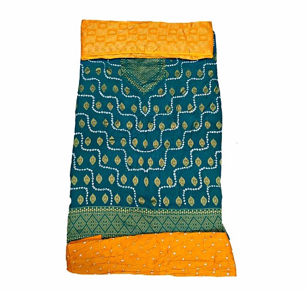 Sea Green & Golden Color Cotton Satin Bandhani Dress
