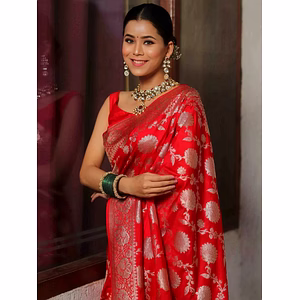 Your Dream Wedding Look Should Seamlessly Fit Your Comfort! The Hustle Bustle Of Weddings Can Be Tiring And Your Outfit For The Day Should Not Come In Between Your Fun. Presenting Enchanting Yet Breathable Organic Banarasi Sarees For Intimate And Big Fat Indian Weddings, That Are Light On Your Skin And Uplift Your Wedding Shenanigans! *Fabric :- LICHI SILK* Saree Length 5.5 Meter Blouse Length 0.8 Meter
