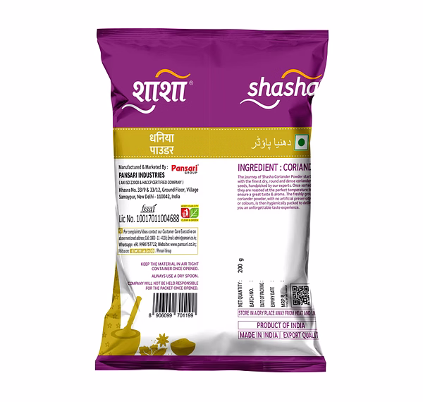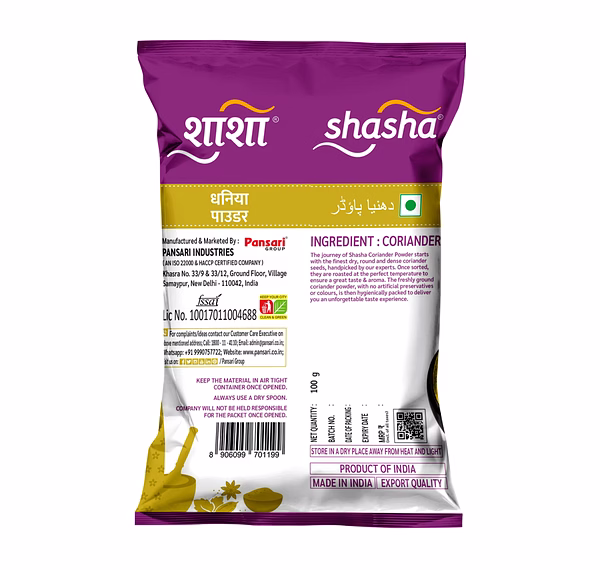 Premium Coriander Quality: Shasha Dhaniya Powder is made from carefully selected coriander seeds to ensure natural flavor, aroma, and freshness in cooking.