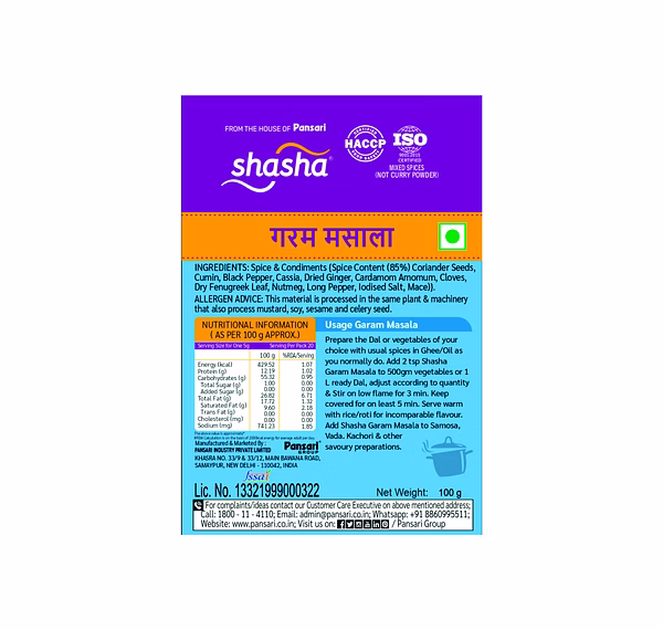 Premium Spice Blend: Shasha Garam Masala is made from carefully selected aromatic spices to deliver authentic Indian flavor.