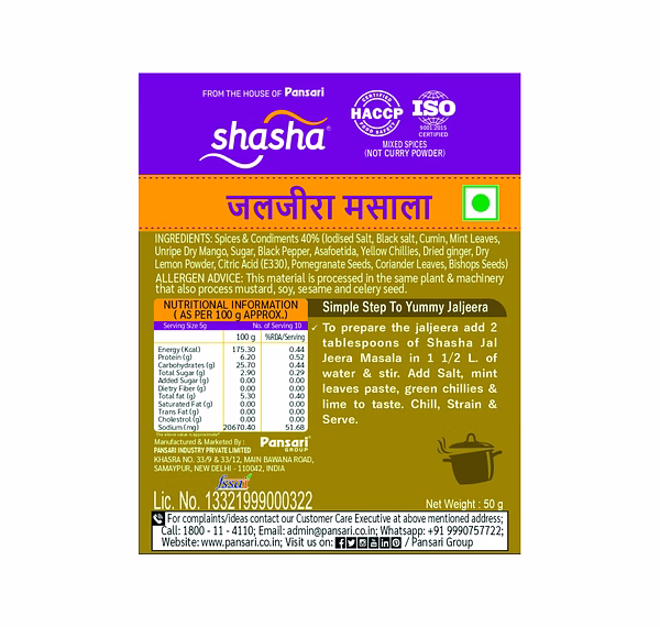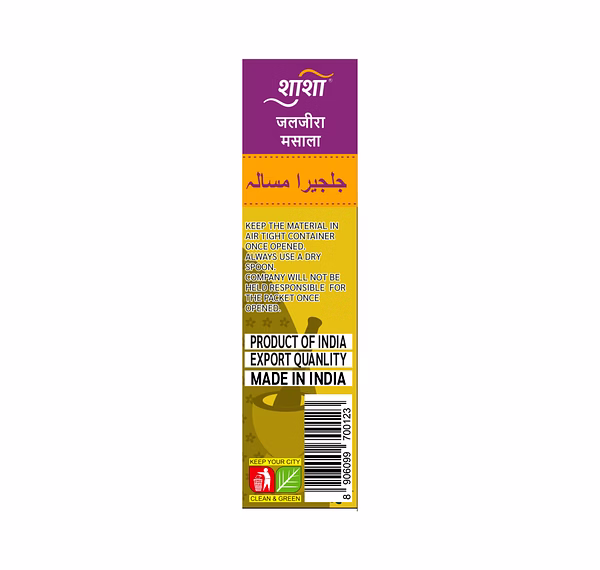 Refreshing Drink Mix: Shasha Jaljeera Powder is specially blended to prepare traditional Indian jaljeera beverages with a tangy and spicy taste.