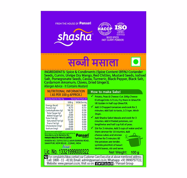 All-Purpose Vegetable Spice: Shasha Sabzi Masala is specially blended to enhance the taste of vegetable dishes.