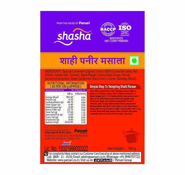 Rich Paneer Curry Spice: Shasha Shahi Paneer Masala is specially blended to create flavorful and creamy paneer dishes.