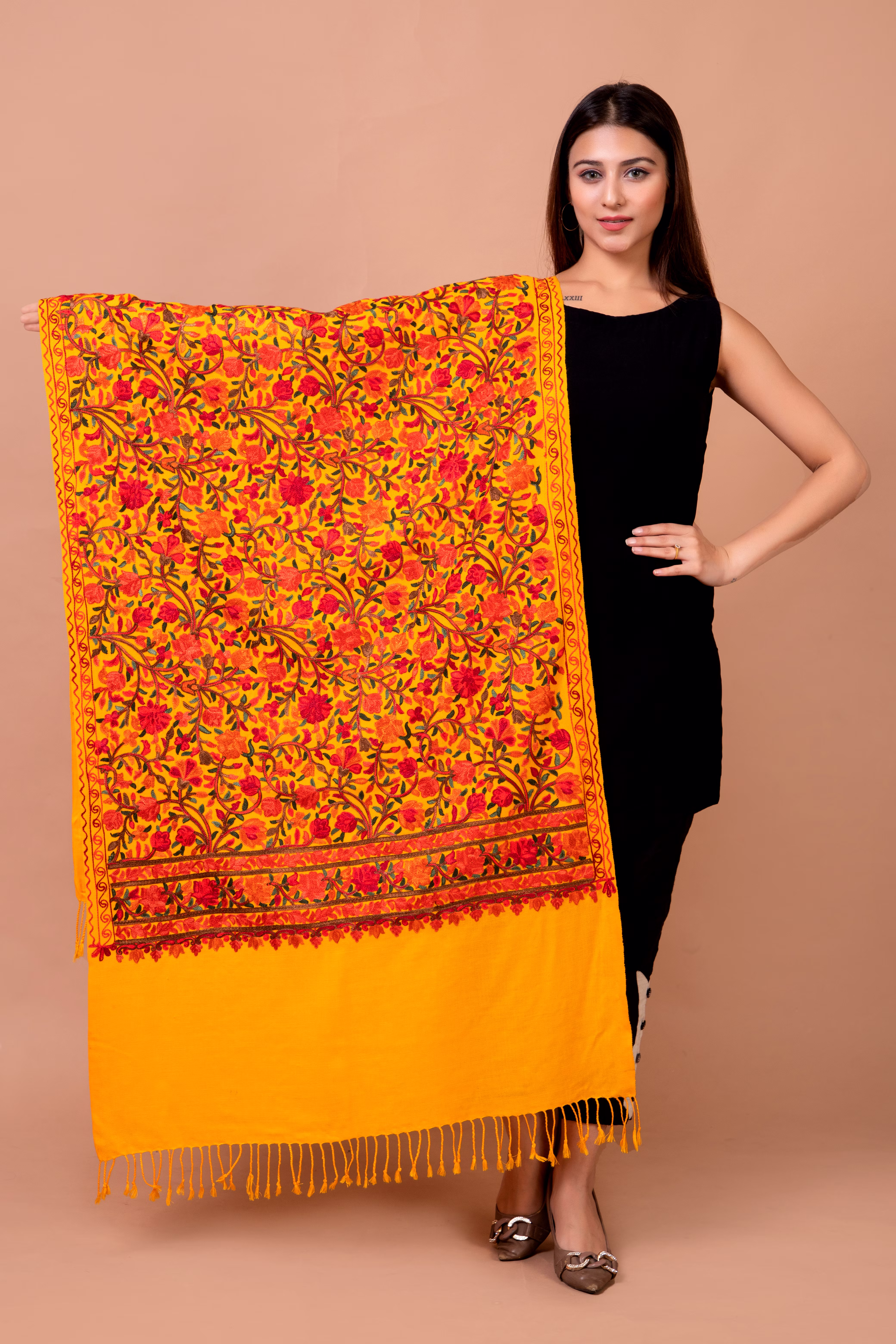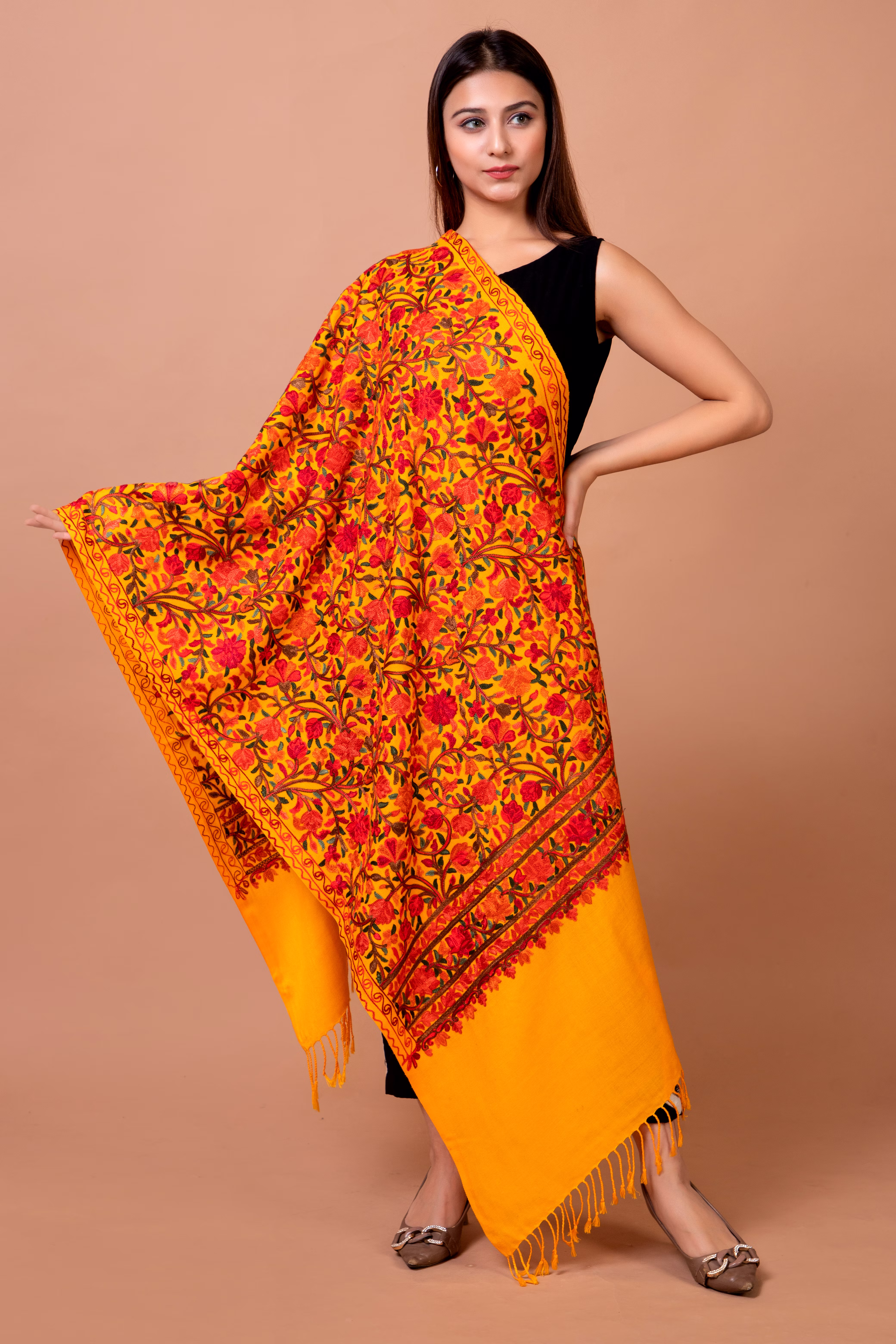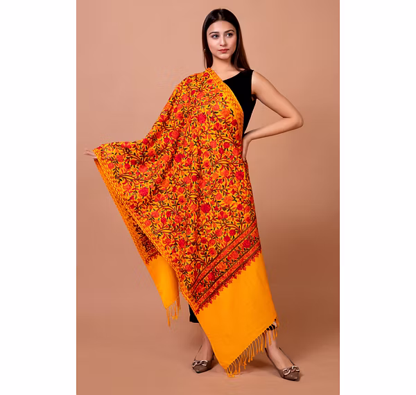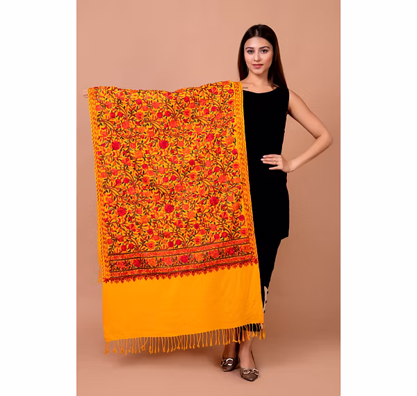 *This ostentatious Kashmiri stole is adorned with intricate and meticulous paisley and floral aari designs tracing their roots to centuries old Kashmiri heritage.