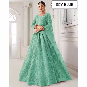 Experience the allure of blue shades with our sky blue net lehenga. This ethnic attire combines tradition with modern aesthetics, perfect for those who seek sophistication in every detail.
